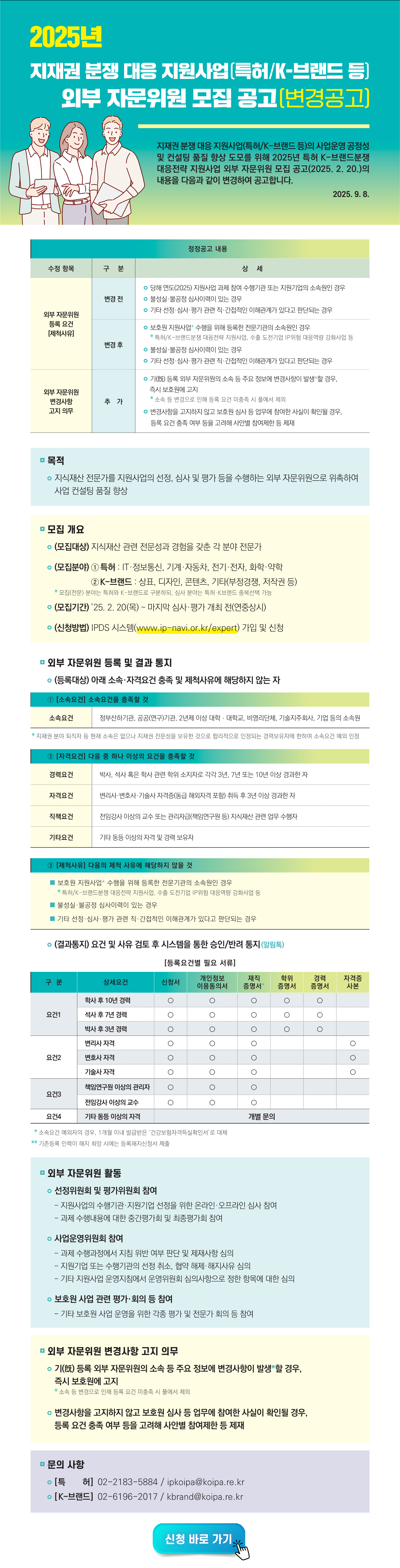 지재권 분쟁 대응 지원사업(특허/K-브랜드 등) 외부 자문위원 모집 공고(변경공고) 작성자관리자 작성일2025-09-08 조회수 1,694 첨부파일 [ 2 ] 1. 지재권 분쟁 대응 지원사업(특허·K-브랜드 등) 외부 자문위원 모집 공고문 이미지.pdf (589KB) 2. 지재권 분쟁 대응 지원사업(특허·K-브랜드 등) 외부 자문위원 모집 공고문.pdf (156KB)