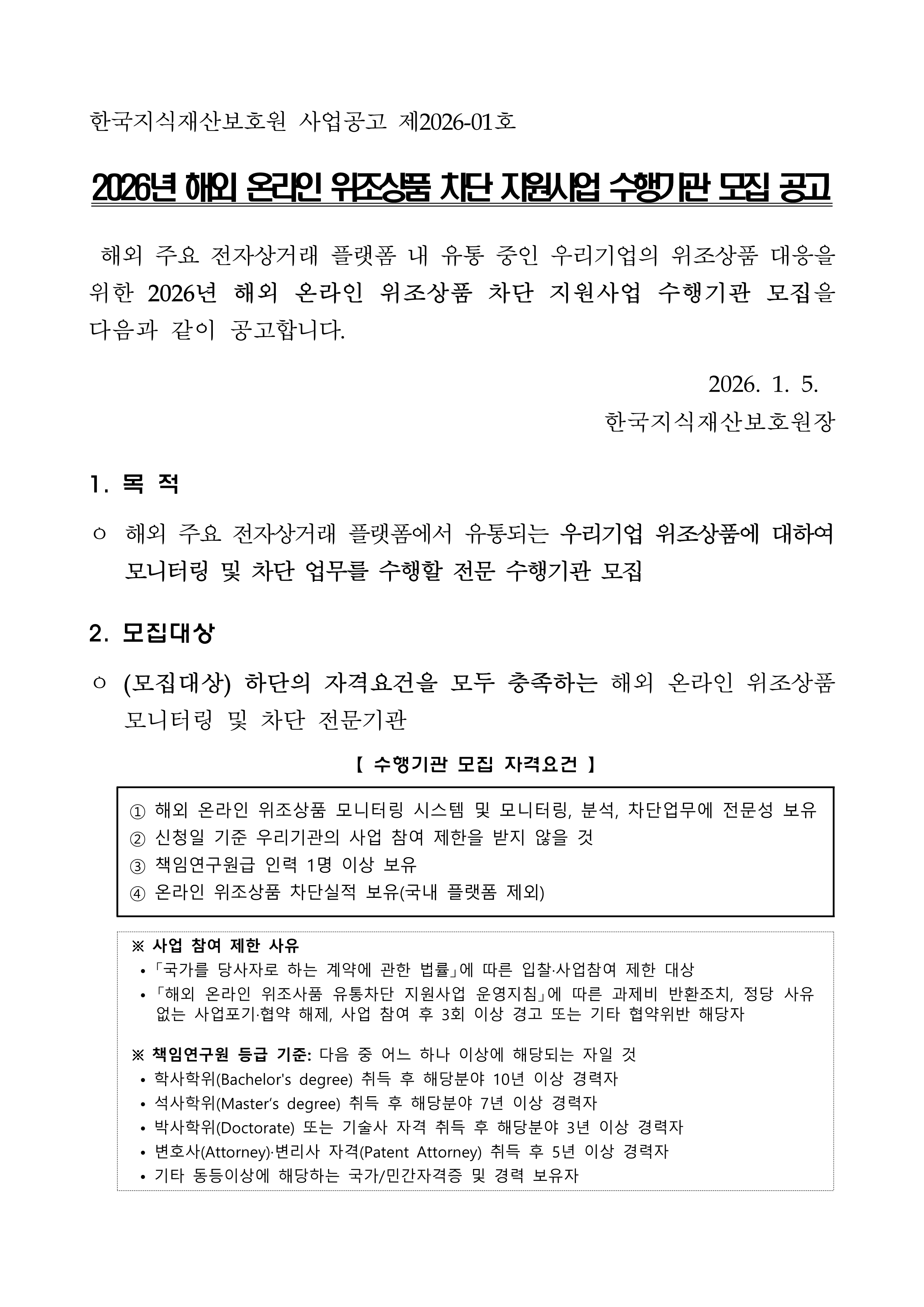 2026년 해외 온라인 위조상품 차단 지원사업 수행기관 모집 공고