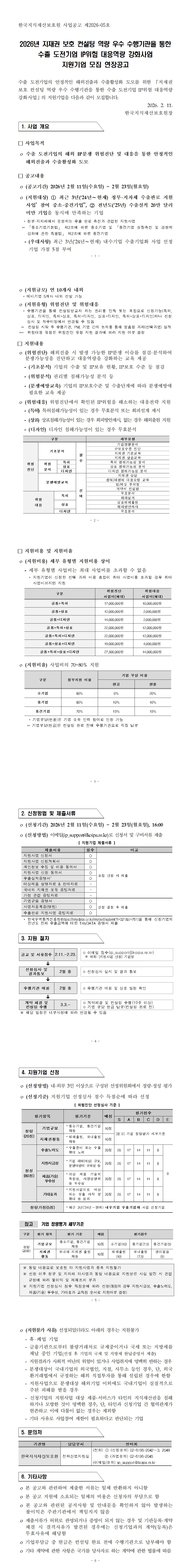 2026년 지재권 보호 컨설팅 역량 우수 수행기관을 통한 수출 도전기업 IP위험 대응역량 강화사업 지원기업 모집 연장공고