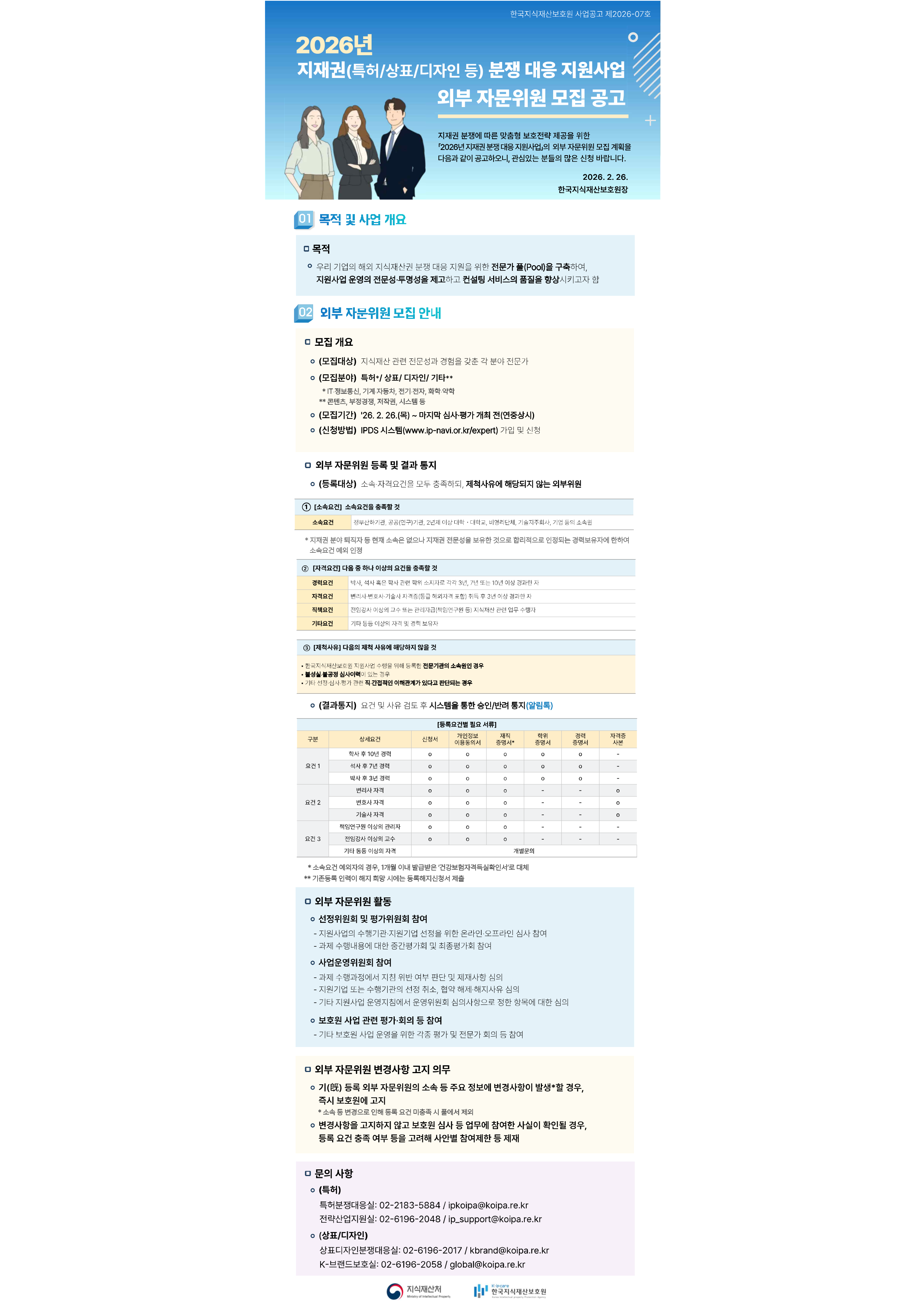 2026년 지재권 분쟁 대응 지원사업 외부 자문위원 모집 공고 작성자관리자 작성일2026-02-25 조회수 49 첨부파일 [ 1 ] [모집공고문] 2026년 지재권 분쟁 대응 지원사업 외부 자문위원 모집.pdf (288KB)
