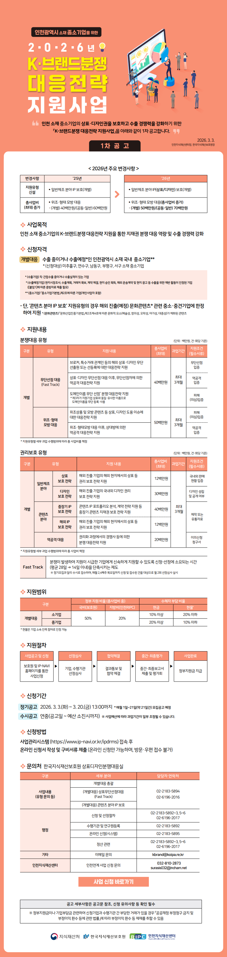 [정기1차_인천연계] 2026년 K-브랜드분쟁 대응전략 지원사업 정기 1차 공고 작성자관리자 작성일2026-03-03 조회수 54 첨부파일 [ 2 ] [인천연계] 2026년 K-브랜드분쟁 대응전략 지원사업 1차 공고.pdf (428KB) 2026년 K-브랜드분쟁 대응전략 지원사업 공고 붙임자료.zip (3,622KB)