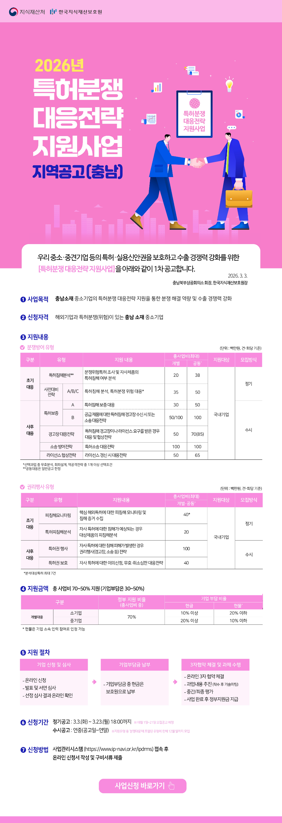 [충남연계_정기 1차] 2026년 특허분쟁 대응전략 지원사업 작성자관리자 작성일2026-03-05 조회수 20 첨부파일 [ 2 ] [공고문] 2026년 특허분쟁 대응전략 지원사업 1차공고_충남.pdf (517KB) ★2026년 특허분쟁 대응전략 지원사업 공고문 붙임.zip (3,569KB)