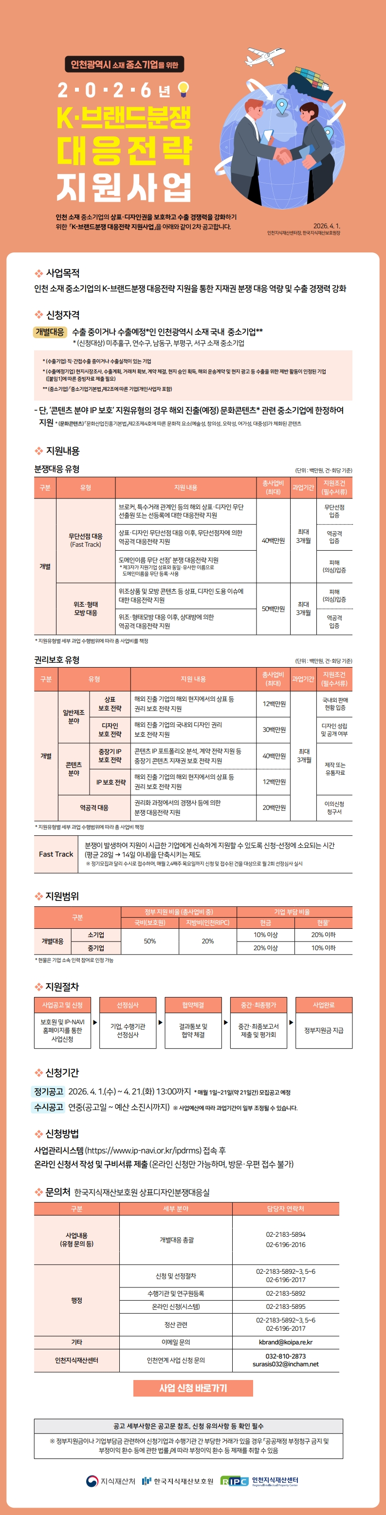 [정기2차_인천연계] 2026년 K-브랜드분쟁 대응전략 지원사업 정기 2차 공고 작성자관리자 작성일2026-04-01 조회수 23 첨부파일 [ 2 ] [인천연계] 2026년 K-브랜드분쟁 대응전략 지원사업 2차 공고.pdf (423KB) 2026년 K-브랜드분쟁 대응전략 지원사업 공고 붙임자료.zip (3,663KB)