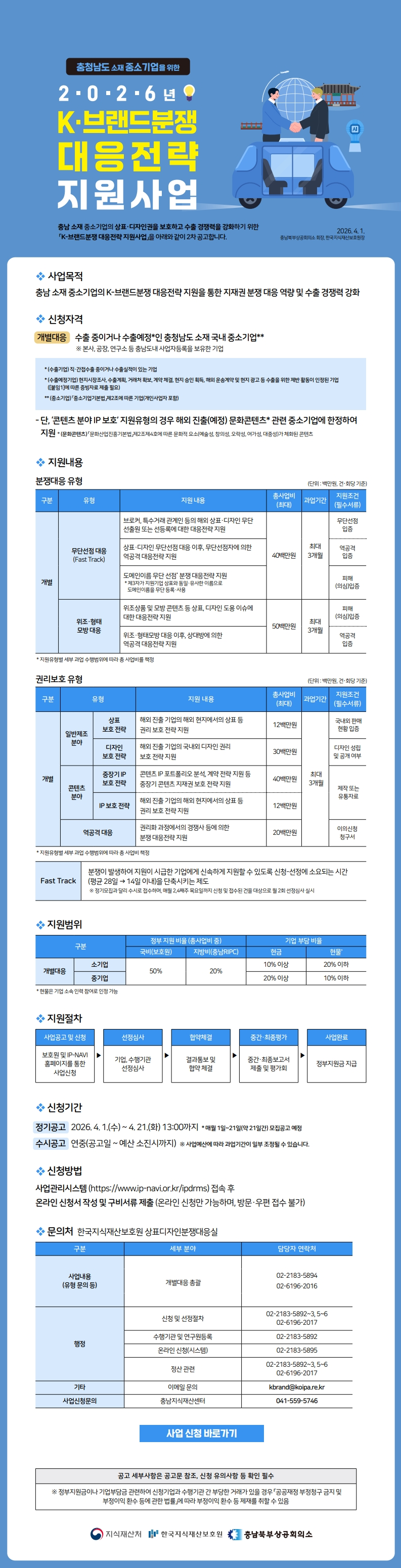 [정기2차_충남연계] 2026년 K-브랜드분쟁 대응전략 지원사업 정기 2차 공고 작성자관리자 작성일2026-04-01 조회수 30 첨부파일 [ 2 ] [충남연계] 2026년 K-브랜드분쟁 대응전략 지원사업 2차 공고.pdf (386KB) 2026년 K-브랜드분쟁 대응전략 지원사업 공고 붙임자료.zip (3,663KB)