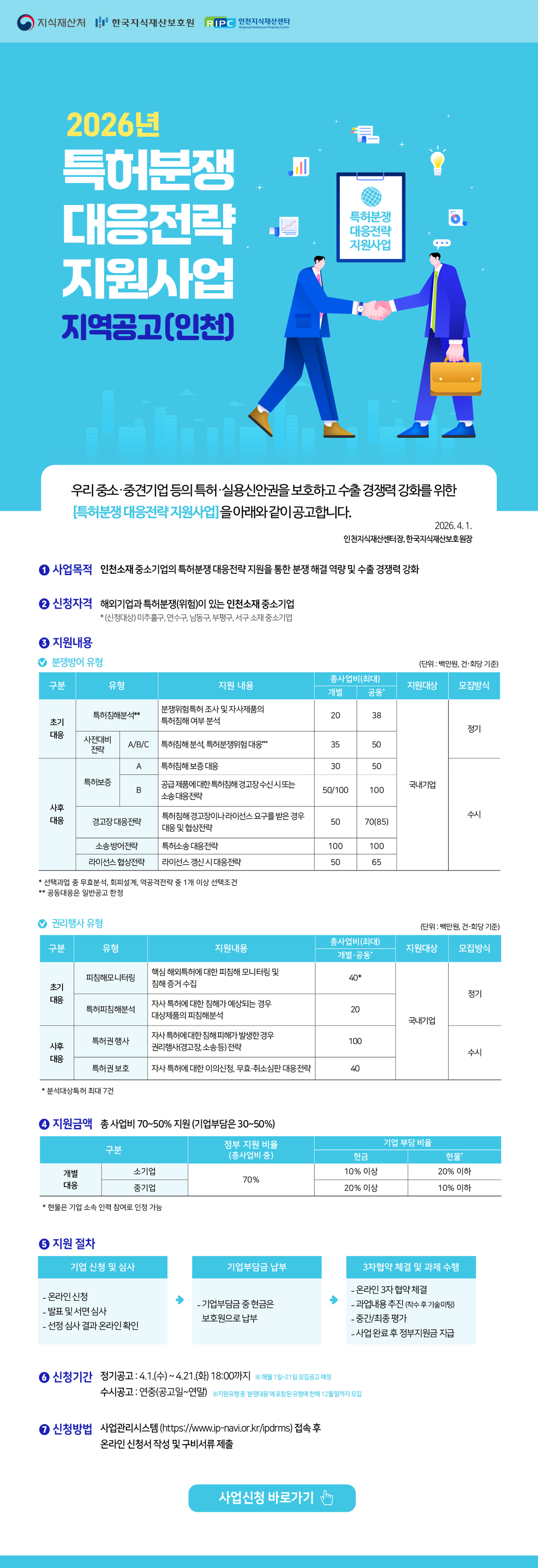 [인천연계_정기 2차] 2026년 특허분쟁 대응전략 지원사업 작성자관리자 작성일2026-04-06 조회수 10 첨부파일 [ 2 ] [공고문] 2026년 특허분쟁 대응전략 지원사업 2차공고_인천.pdf (519KB) ★2026년 특허분쟁 대응전략 지원사업 공고문 붙임.zip (3,569KB)