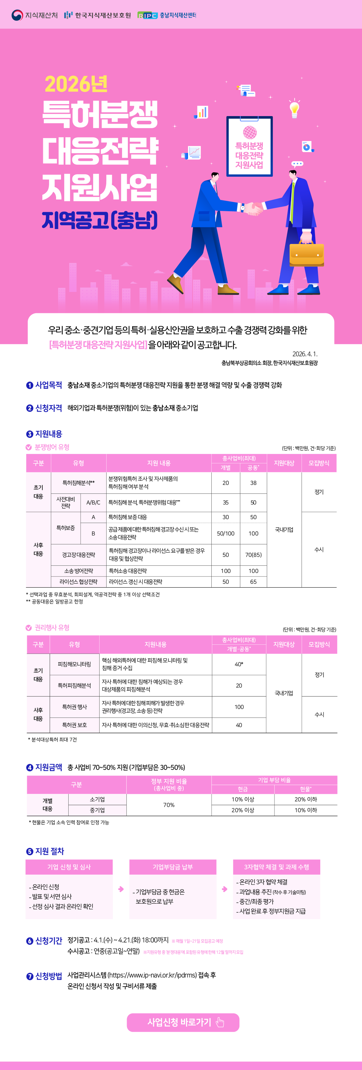 [충남연계_정기 2차] 2026년 특허분쟁 대응전략 지원사업 작성자관리자 작성일2026-04-06 조회수 9 첨부파일 [ 2 ] [공고문] 2026년 특허분쟁 대응전략 지원사업 2차공고_충남.pdf (517KB) ★2026년 특허분쟁 대응전략 지원사업 공고문 붙임.zip (3,569KB)