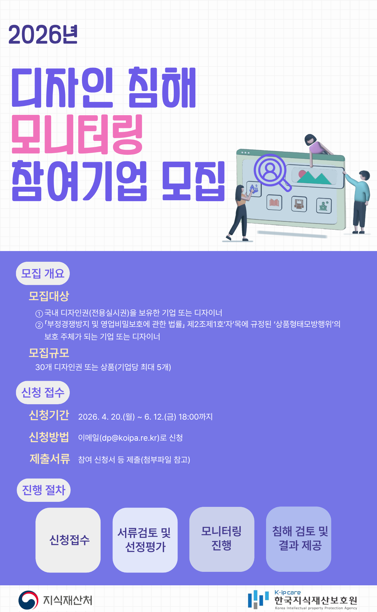 2026년 디자인 침해 모니터링 사업 공고 작성자관리자 작성일2026-04-17 조회수 15 첨부파일 [ 2 ] [붙임1] 2026년 디자인 침해 모니터링 사업 공고.hwp (67KB) [붙임2] 참여신청 제출서류.hwp (57KB)