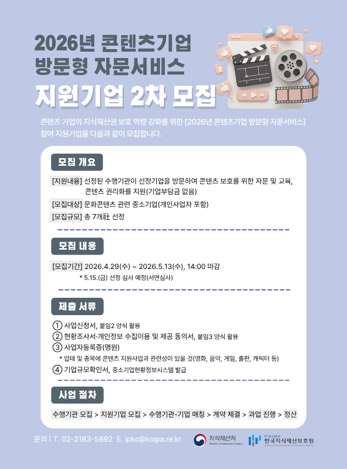 2026년 콘텐츠기업 방문형 자문서비스(상표·디자인) 지원기업 2차 모집공고 작성자관리자 작성일2026-04-29 조회수 52 첨부파일 [ 3 ] 2. 2026년 콘텐츠기업 방문형 자문서비스 지원기업 2차 모집공고.hwp (144KB) 3. 2026년 콘텐츠기업 방문형 자문서비스 지원기업 모집 붙임자료.zip (111KB) 4. 수행기관 소개자료.zip (6,050KB)