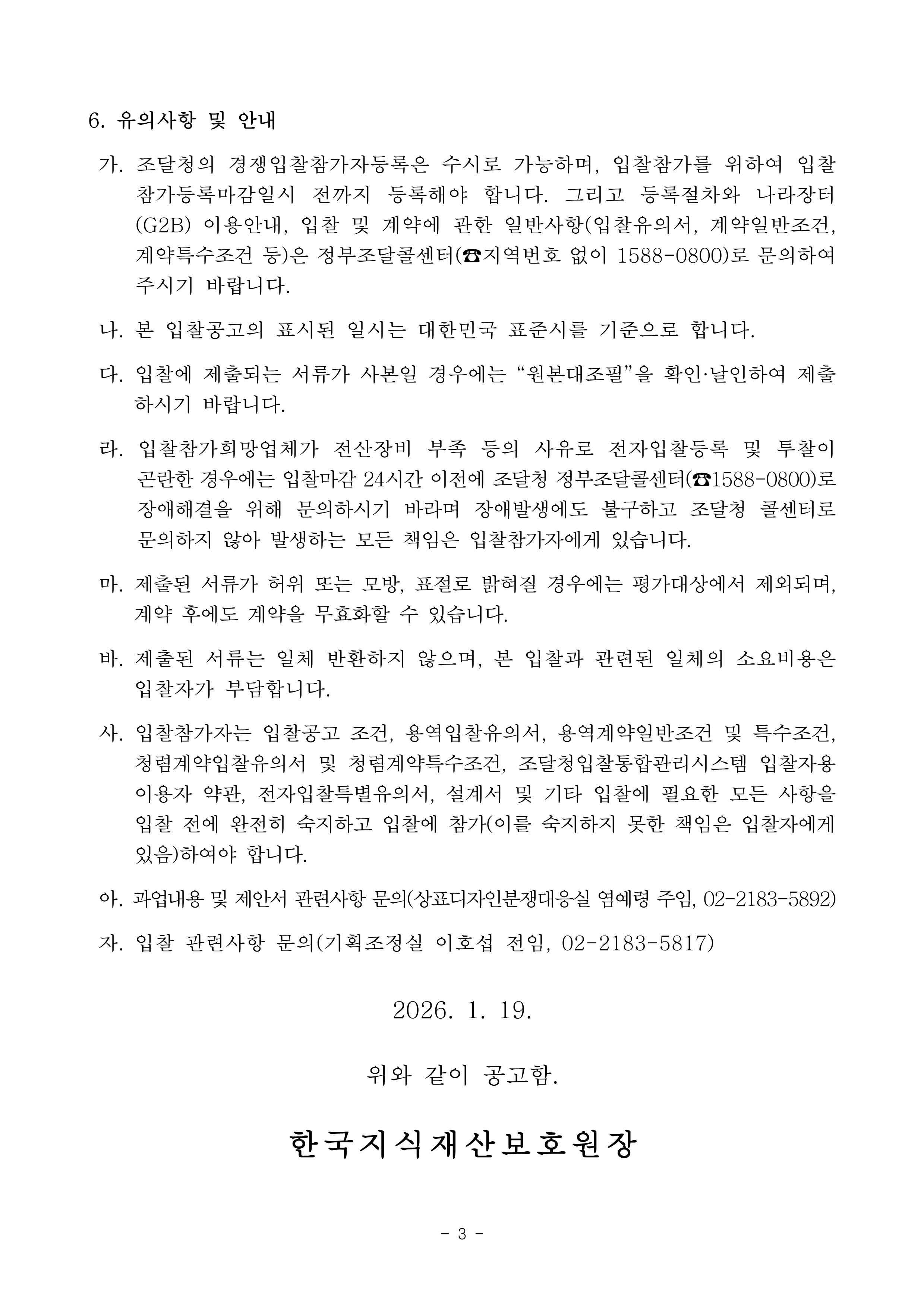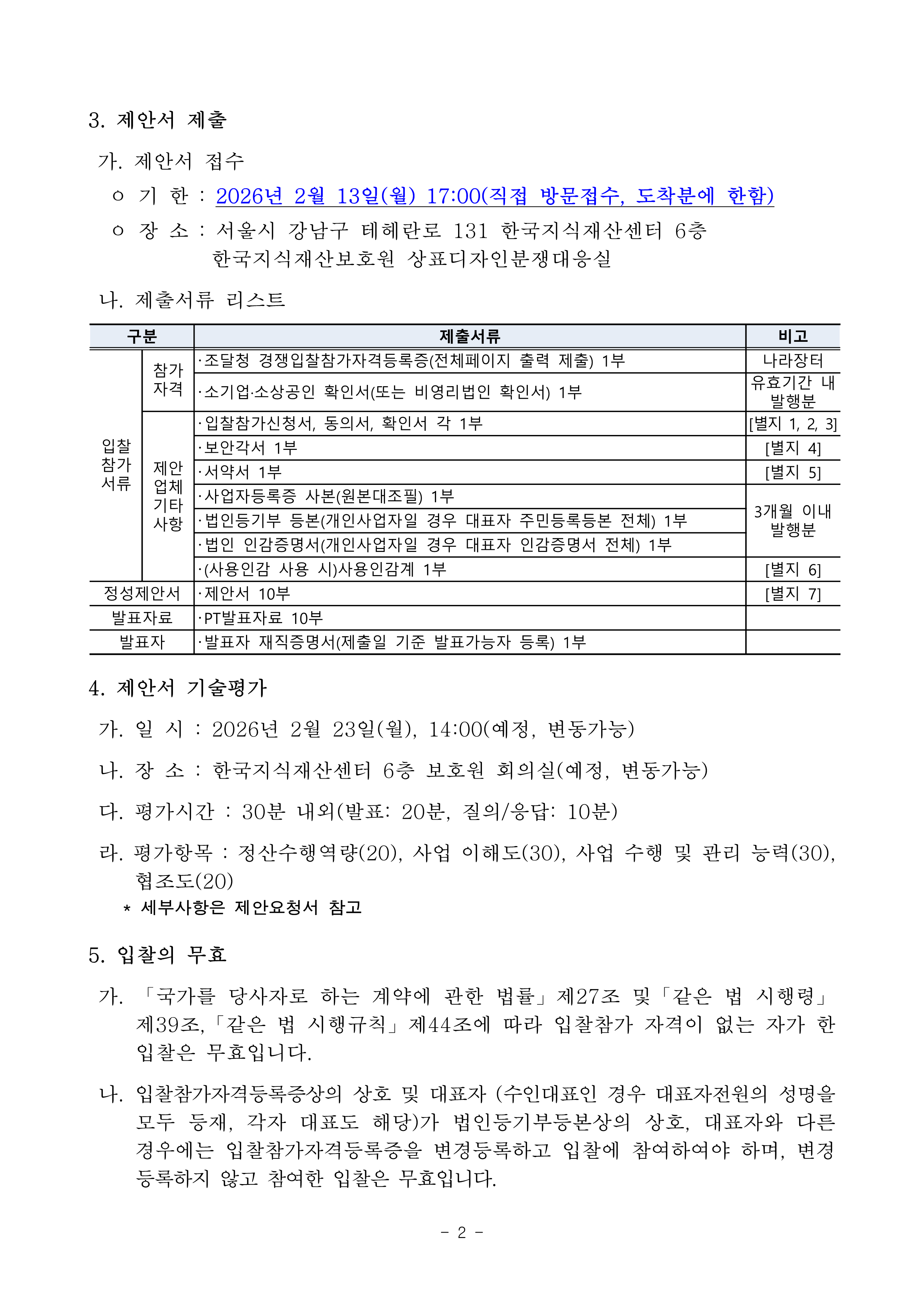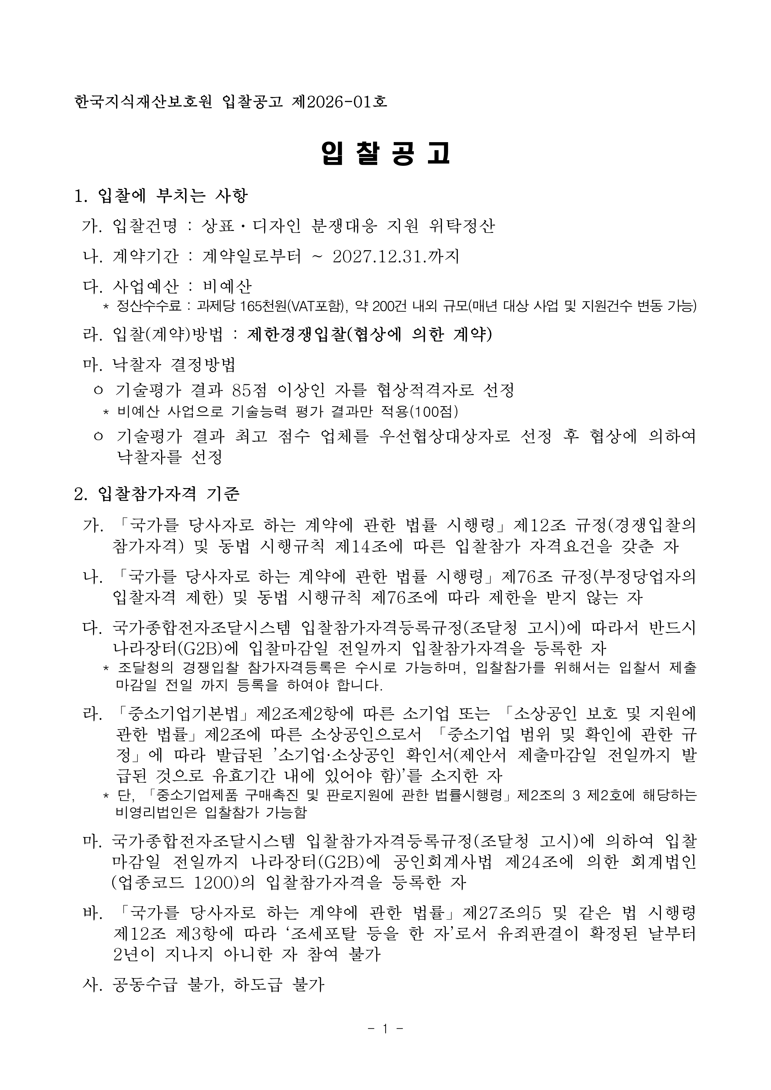 상표·디자인 분쟁대응 지원 위탁정산 입찰공고 작성자관리자 작성일2026-01-20 조회수 198 첨부파일 [ 2 ] 상표·디자인 분쟁대응 지원 위탁정산 입찰공고.hwp (75KB) 상표·디자인 분쟁대응 지원 위탁정산 용역 입찰 제안요청서.hwp (159KB)