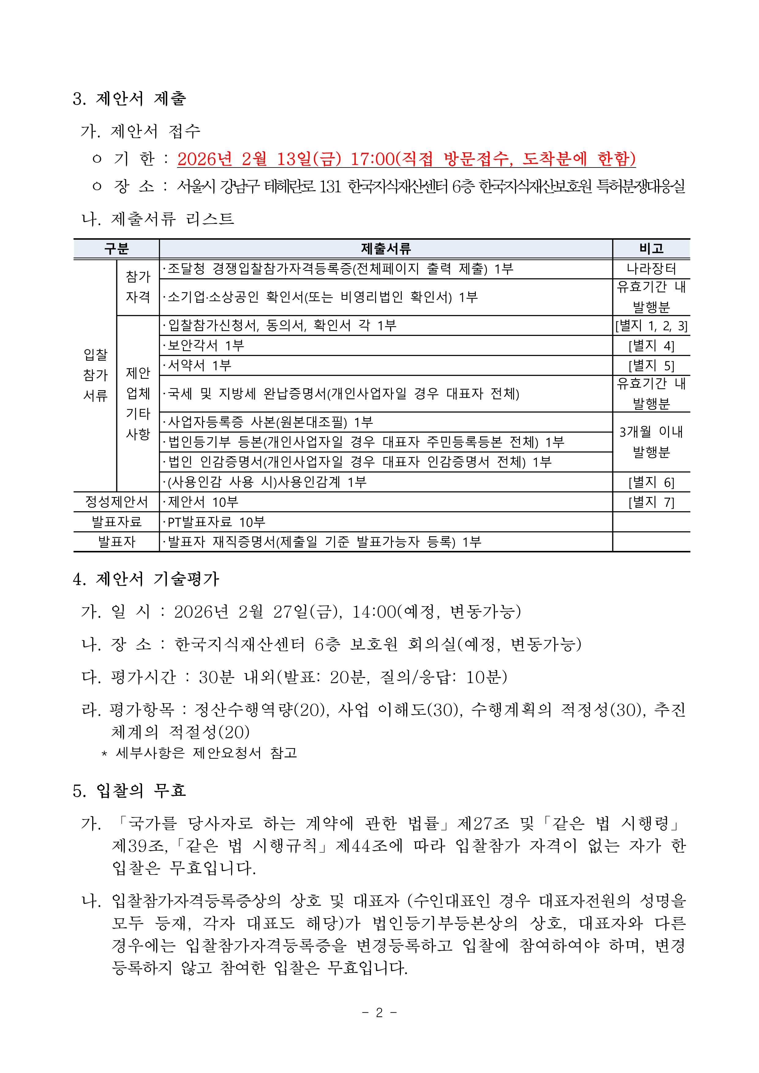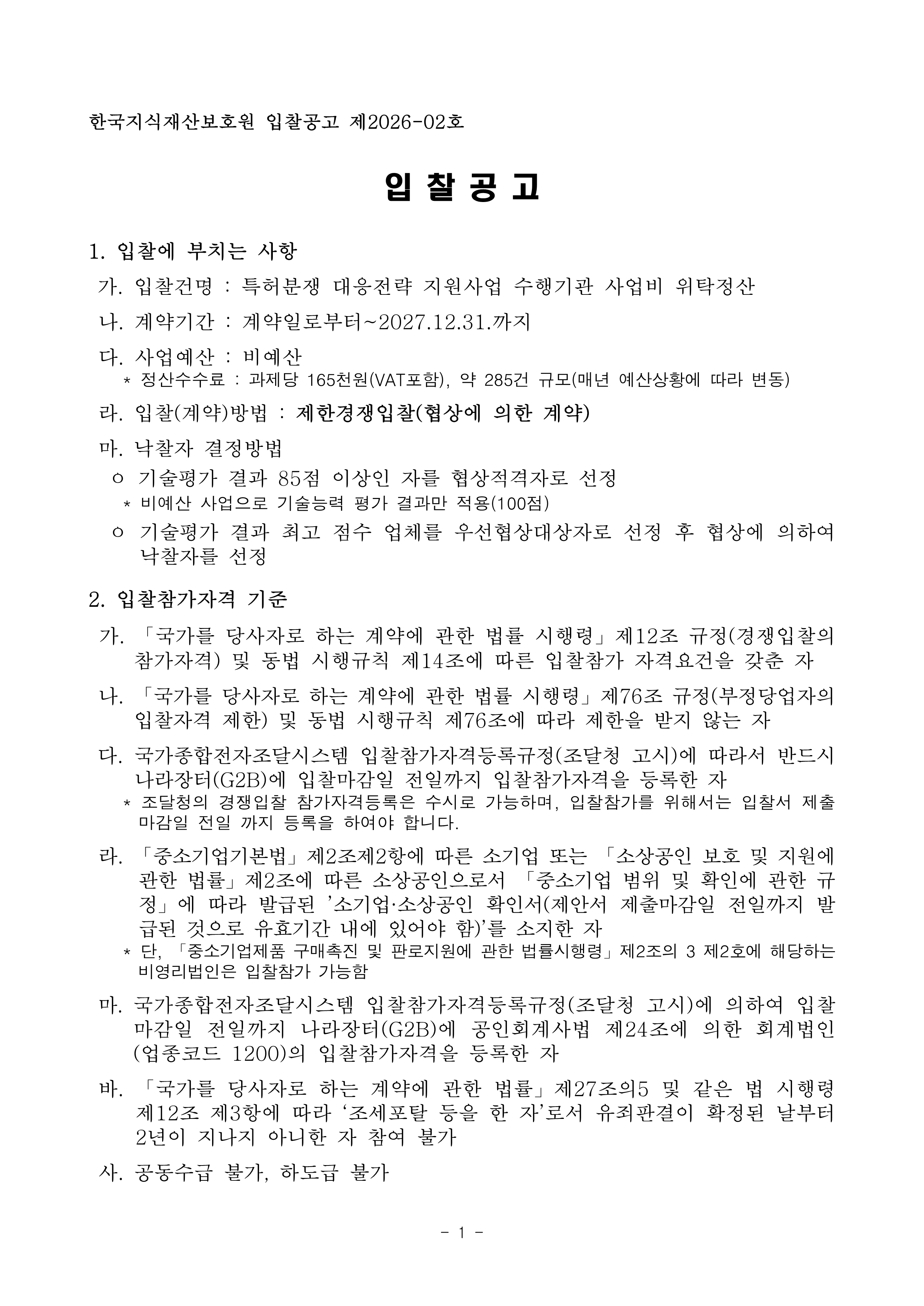 특허분쟁 대응전략 지원사업 수행기관 사업비 위탁정산 입찰공고 작성자관리자 작성일2026-01-30 조회수 102 첨부파일 [ 2 ] 특허분쟁 대응전략 지원사업 수행기관 사업비 위탁정산 입찰공고.hwp (78KB) 특허분쟁 대응전략 지원사업 수행기관 사업비 위탁정산 제안요청서.hwp (122KB)