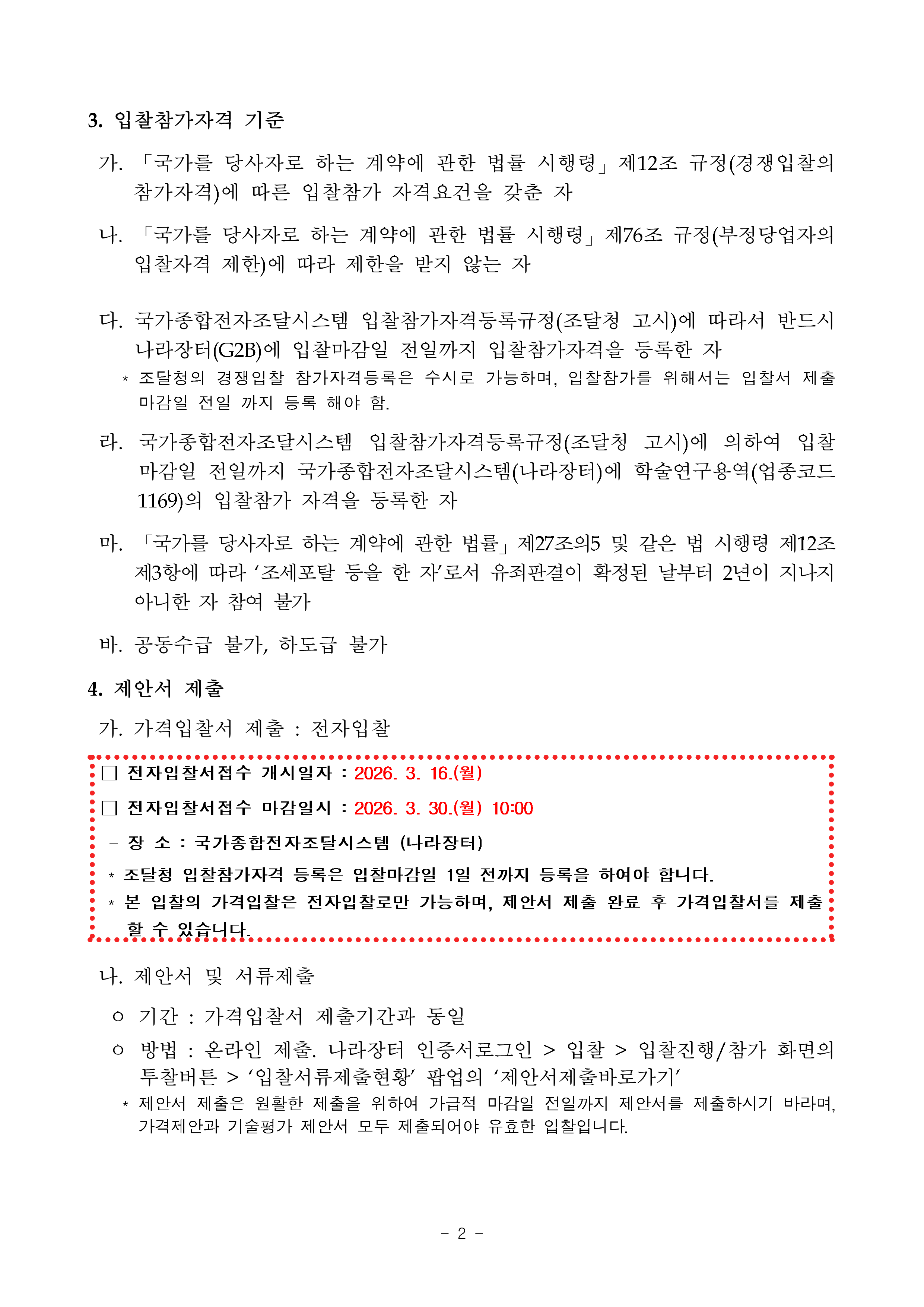 2026년 지식재산 보호 실태조사 입찰공고 작성자관리자 작성일2026-03-16 조회수 44 첨부파일 [ 3 ] 2026년 지식재산 보호 실태조사 용역 입찰공고.pdf (868KB) 2026년 지식재산 보호 실태조사 용역 긴급입찰사유서.hwp (122KB) 2026년 지식재산 보호 실태조사 용역 제안요청서.hwp (131KB)