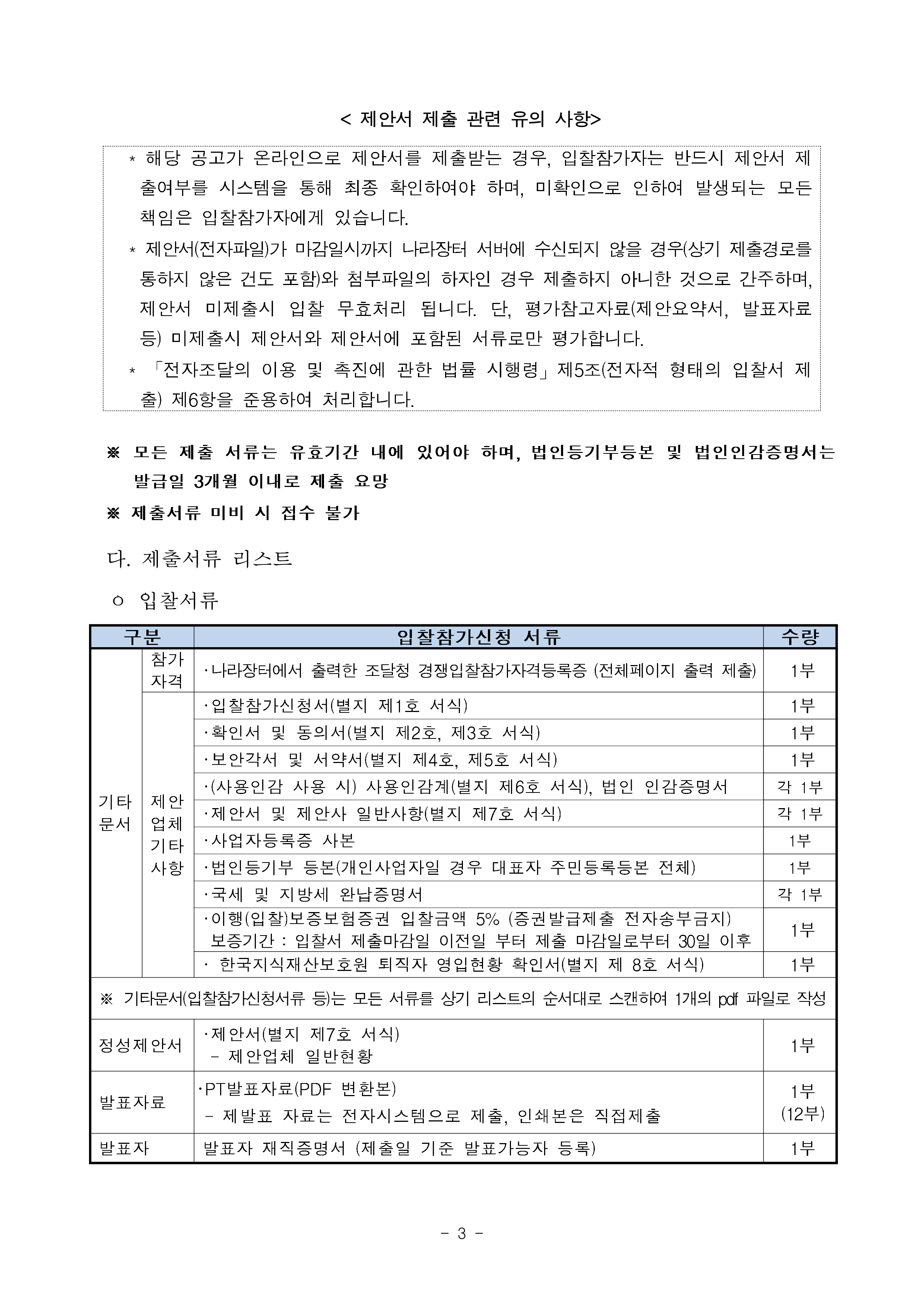 2026년 지식재산 보호 실태조사 입찰공고 작성자관리자 작성일2026-03-16 조회수 12 첨부파일 [ 3 ] 2026년 지식재산 보호 실태조사 용역 입찰공고.pdf (868KB) 2026년 지식재산 보호 실태조사 용역 긴급입찰사유서.hwp (122KB) 2026년 지식재산 보호 실태조사 용역 제안요청서.hwp (131KB)