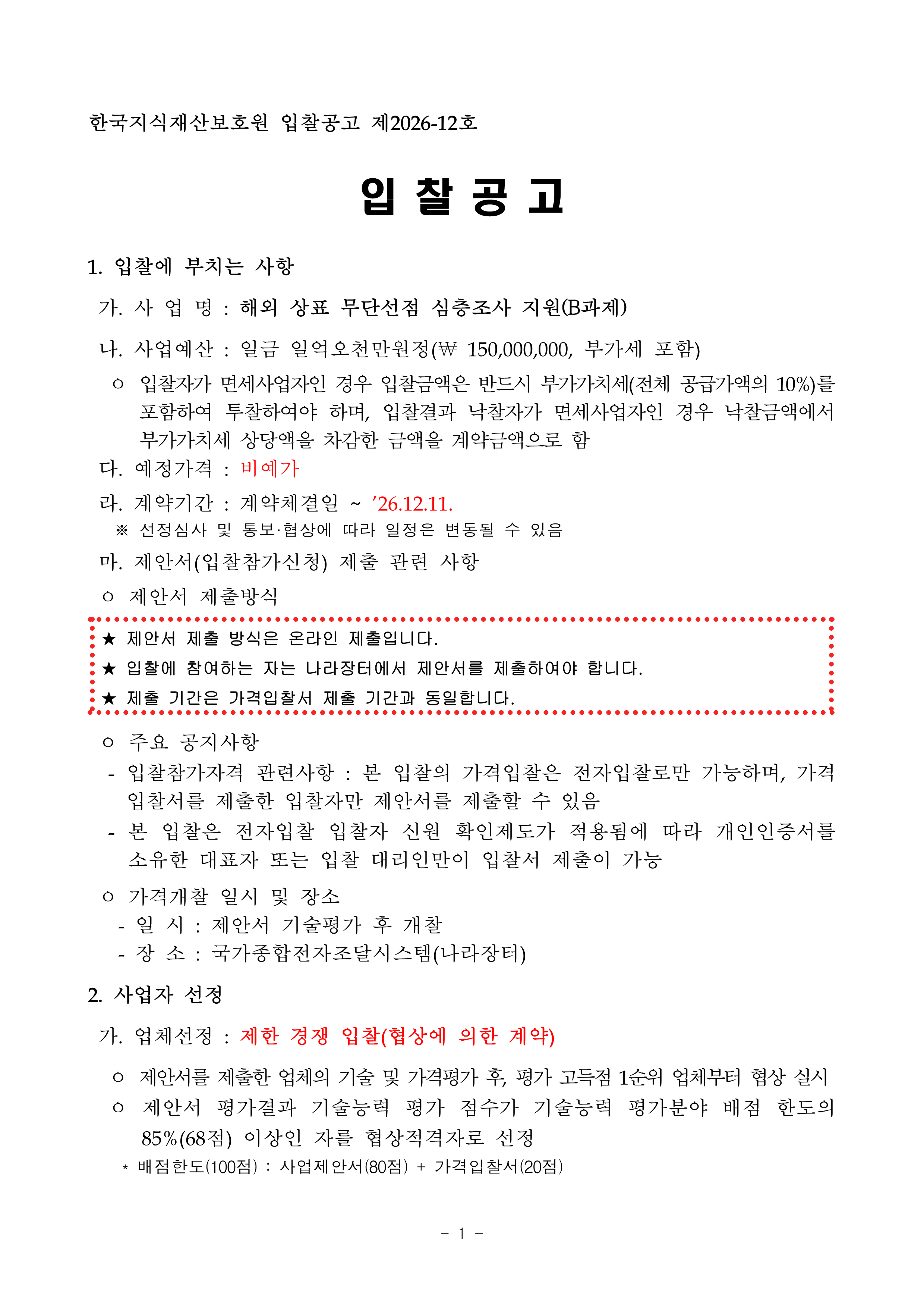 해외 상표 무단선점 심층조사 지원(B과제) 작성자관리자 작성일2026-03-30 조회수 29 첨부파일 [ 2 ] 2026년 해외 상표 무단선점 심층조사(B과제) 지원 입찰공고문.pdf (301KB) 2026년 해외 상표 무단선점 심층조사(B과제) 지원 제안요청서.hwp (357KB)