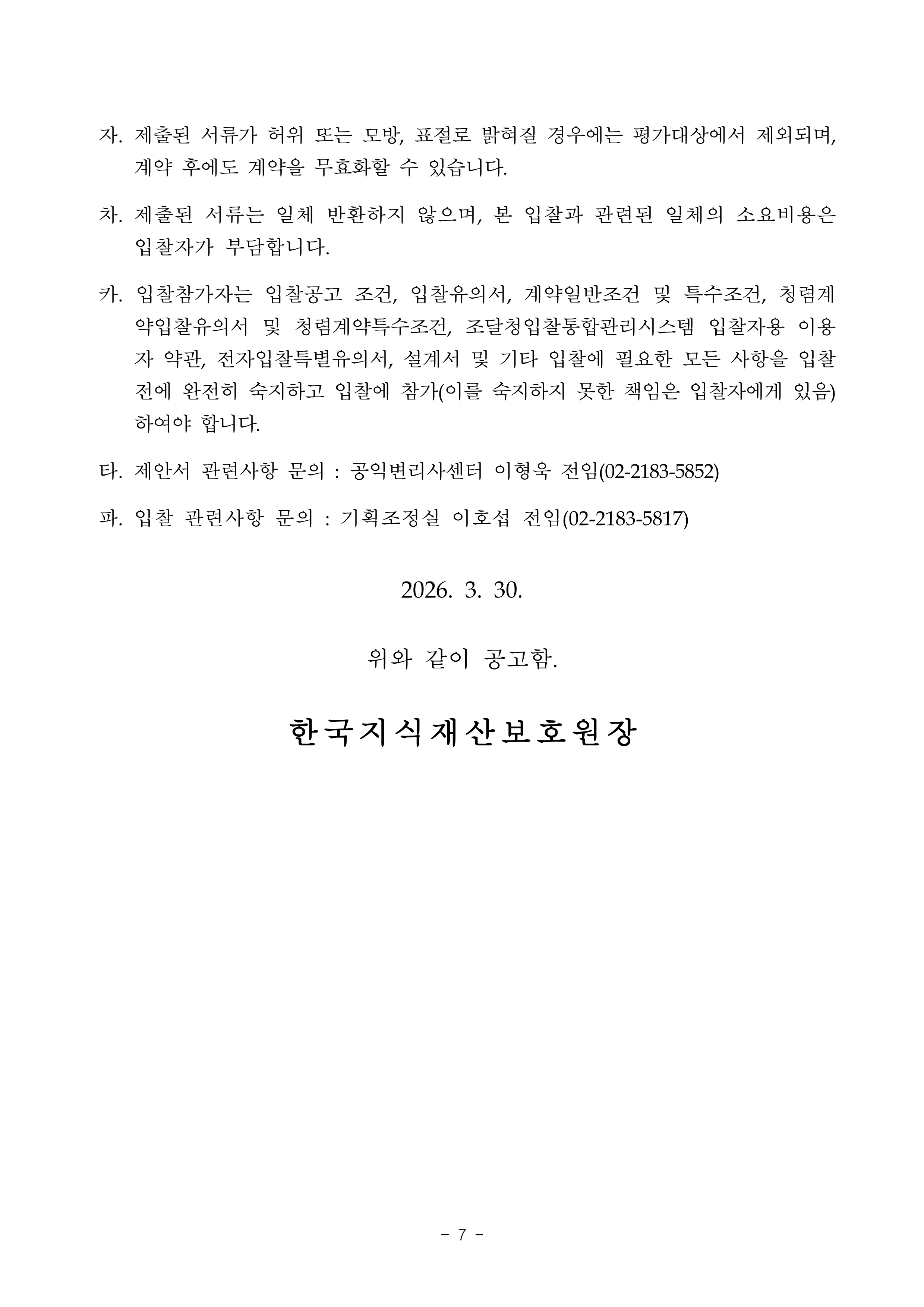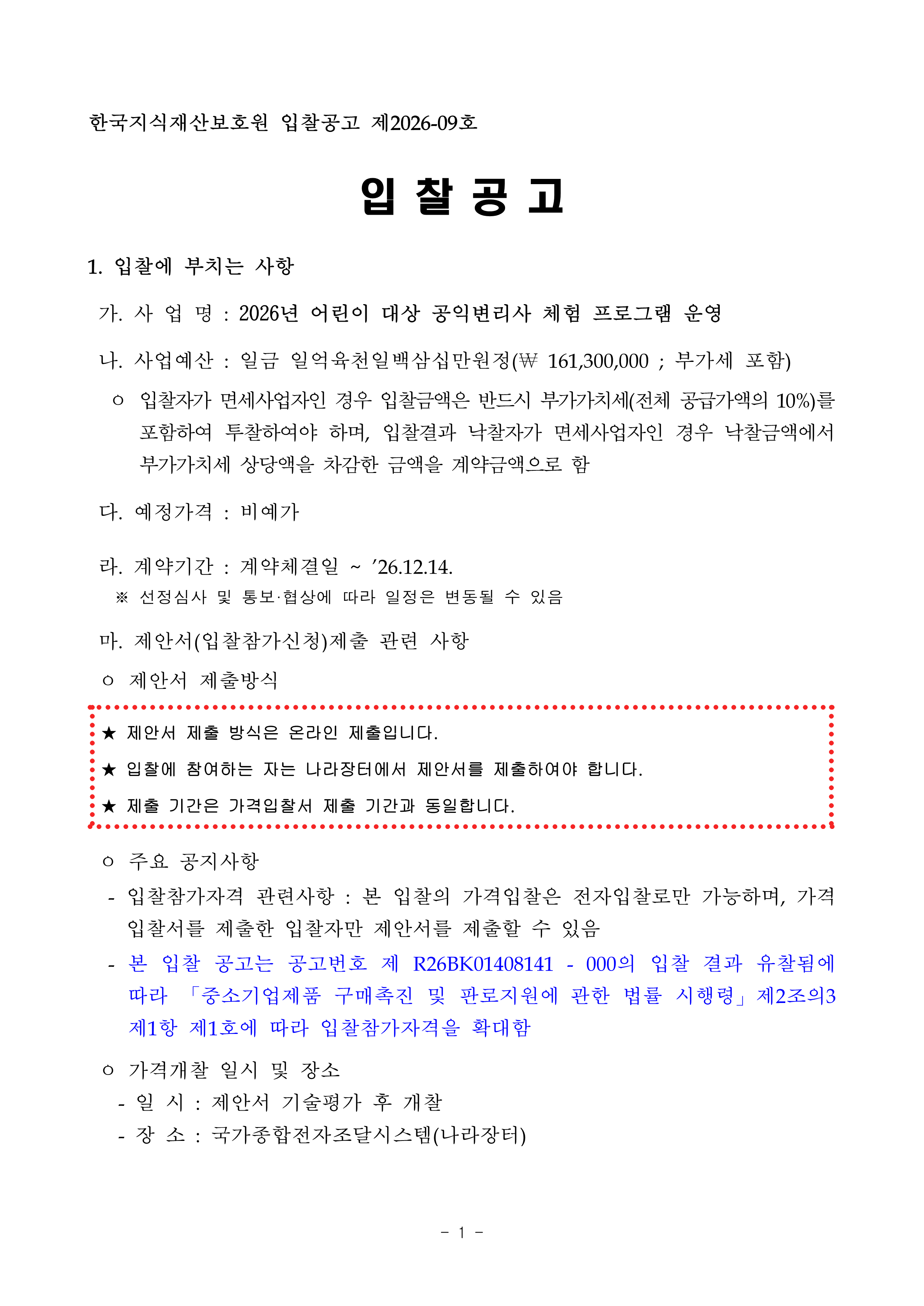 [재공고] 2026년 어린이 대상 공익변리사 체험 프로그램 운영 작성자관리자 작성일2026-03-30 조회수 13 첨부파일 [ 2 ] (재공고)2026년 어린이 대상 공익변리사 체험 프로그램 운영사업 입찰공고문.pdf (309KB) (재공고)2026년 어린이 대상 공익변리사 체험 프로그램 운영사업 제안요청서.hwp (224KB)