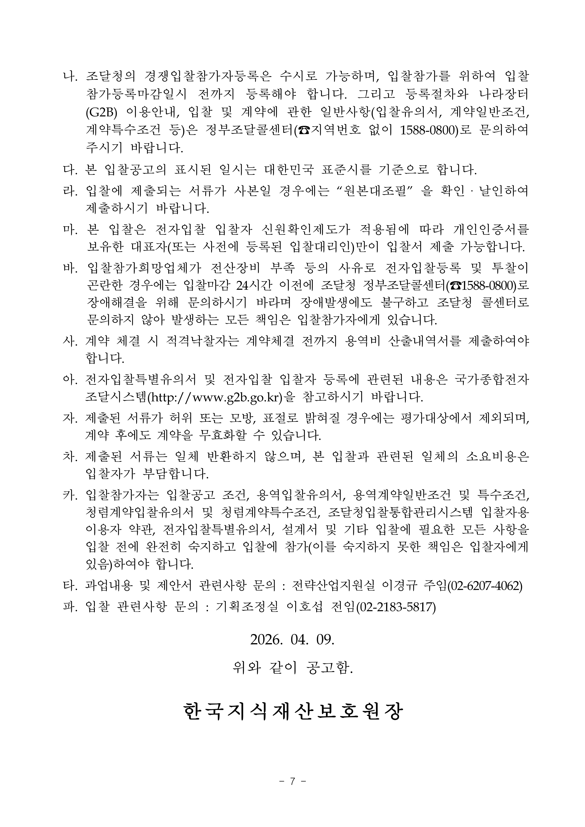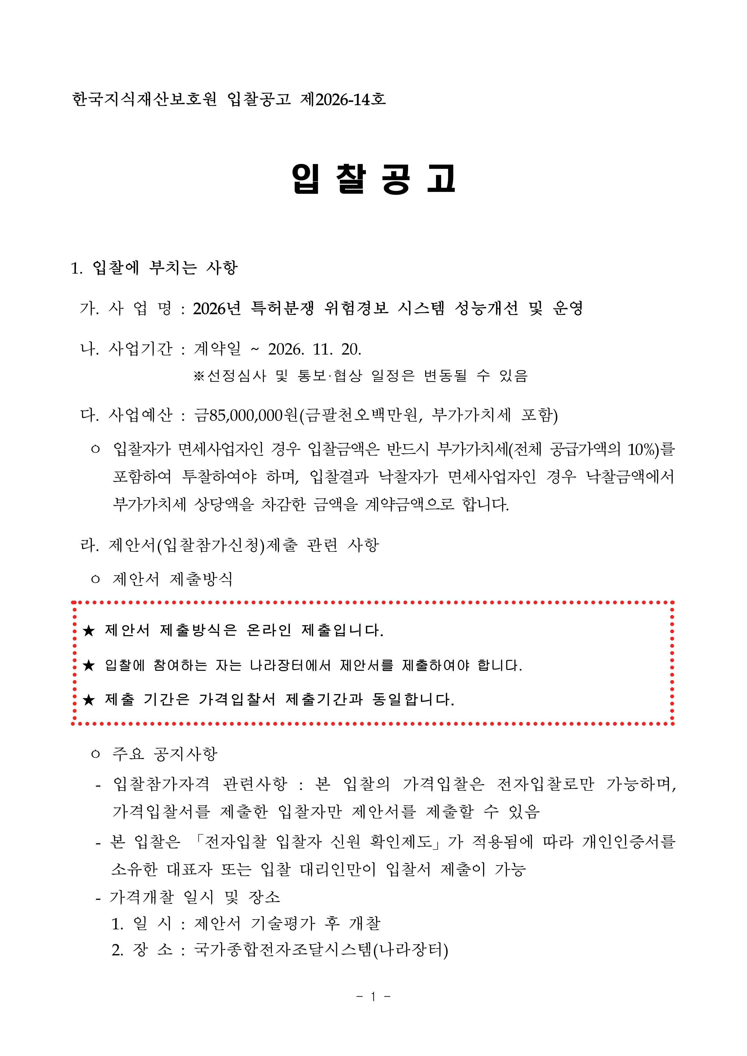2026년 특허분쟁 위험경보 시스템 성능개선 및 운영 사업 입찰공고 작성자관리자 작성일2026-04-13 조회수 75 첨부파일 [ 2 ] 2026년 특허분쟁 위험경보 시스템 성능개선 및 운영 입찰공고문.pdf (317KB) 2026년 특허분쟁 위험경보 시스템 성능개선 및 운영 제안요청서.hwp (823KB)