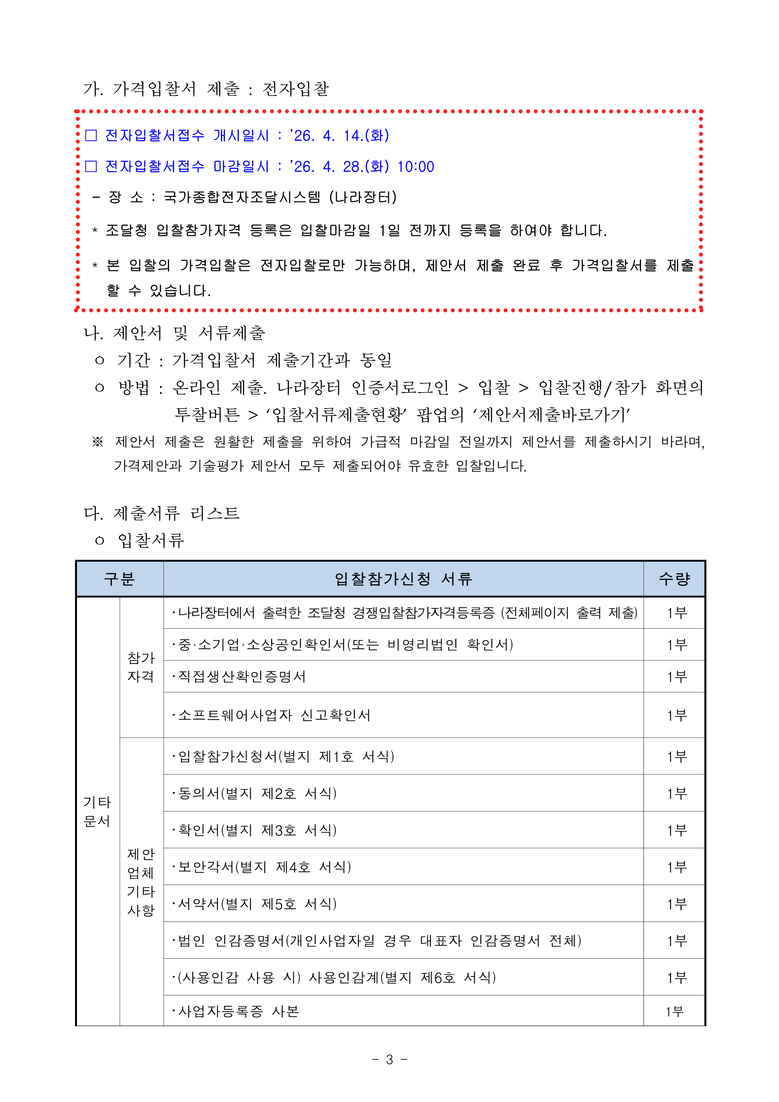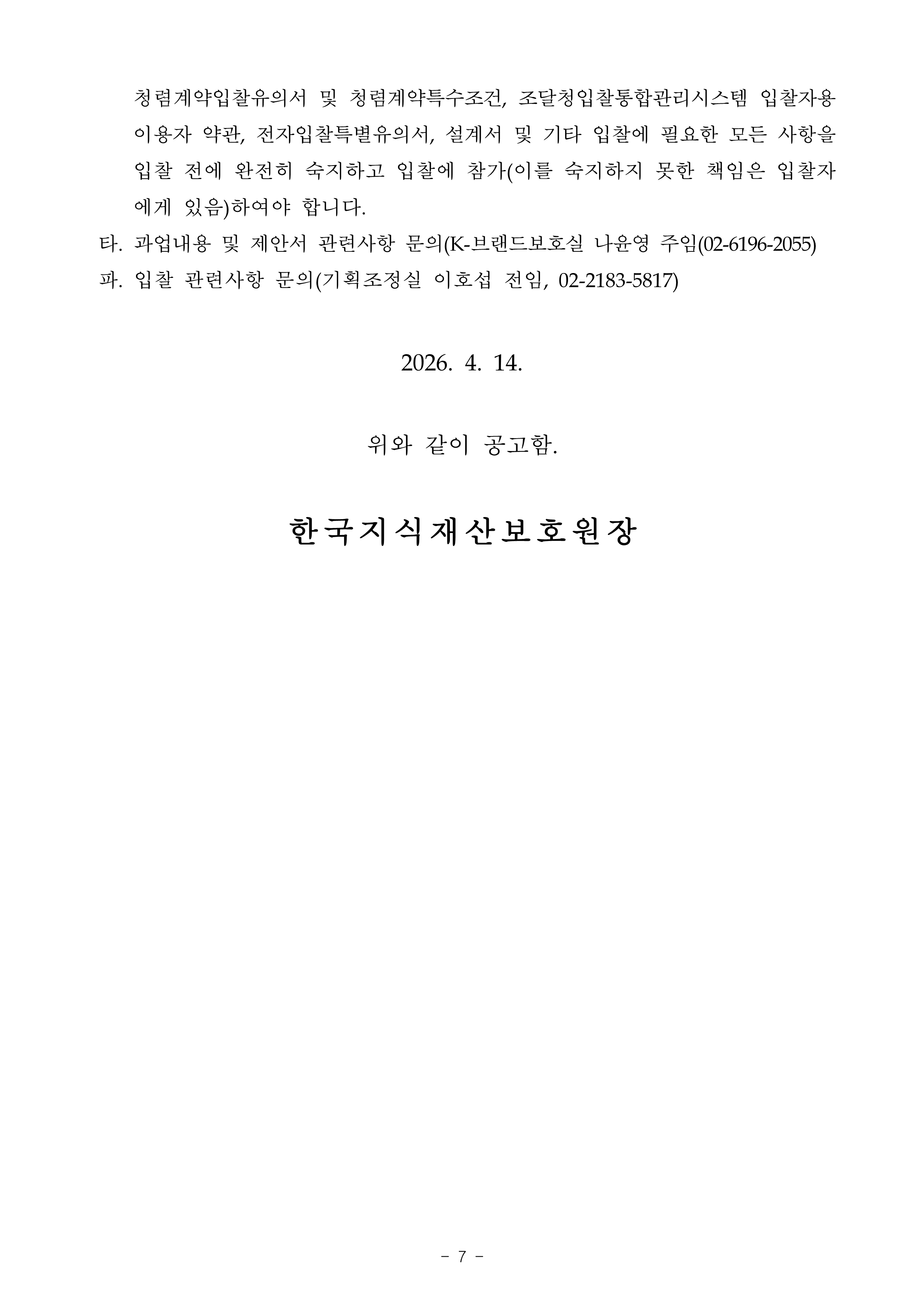 ’26년 해외 상표 무단선점 시스템 기능개선 및 유지관리 사업 입찰공고 작성자관리자 작성일2026-04-14 조회수 9 첨부파일 [ 2 ] ’26년 해외 상표 무단선점 시스템 기능개선 및 유지관리 사업 입찰공고문.pdf (281KB) ’26년 해외 상표 무단선점 시스템 기능개선 및 유지관리 사업 제안요청서.hwp (1,408KB)