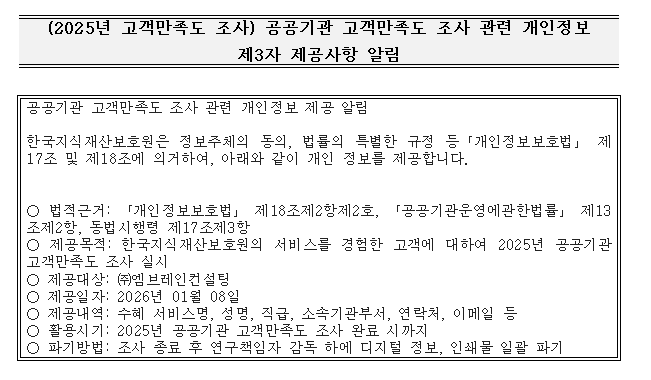 공공기관 고객만족도 조사 관련 개인정보 제3자 제공사항 알림