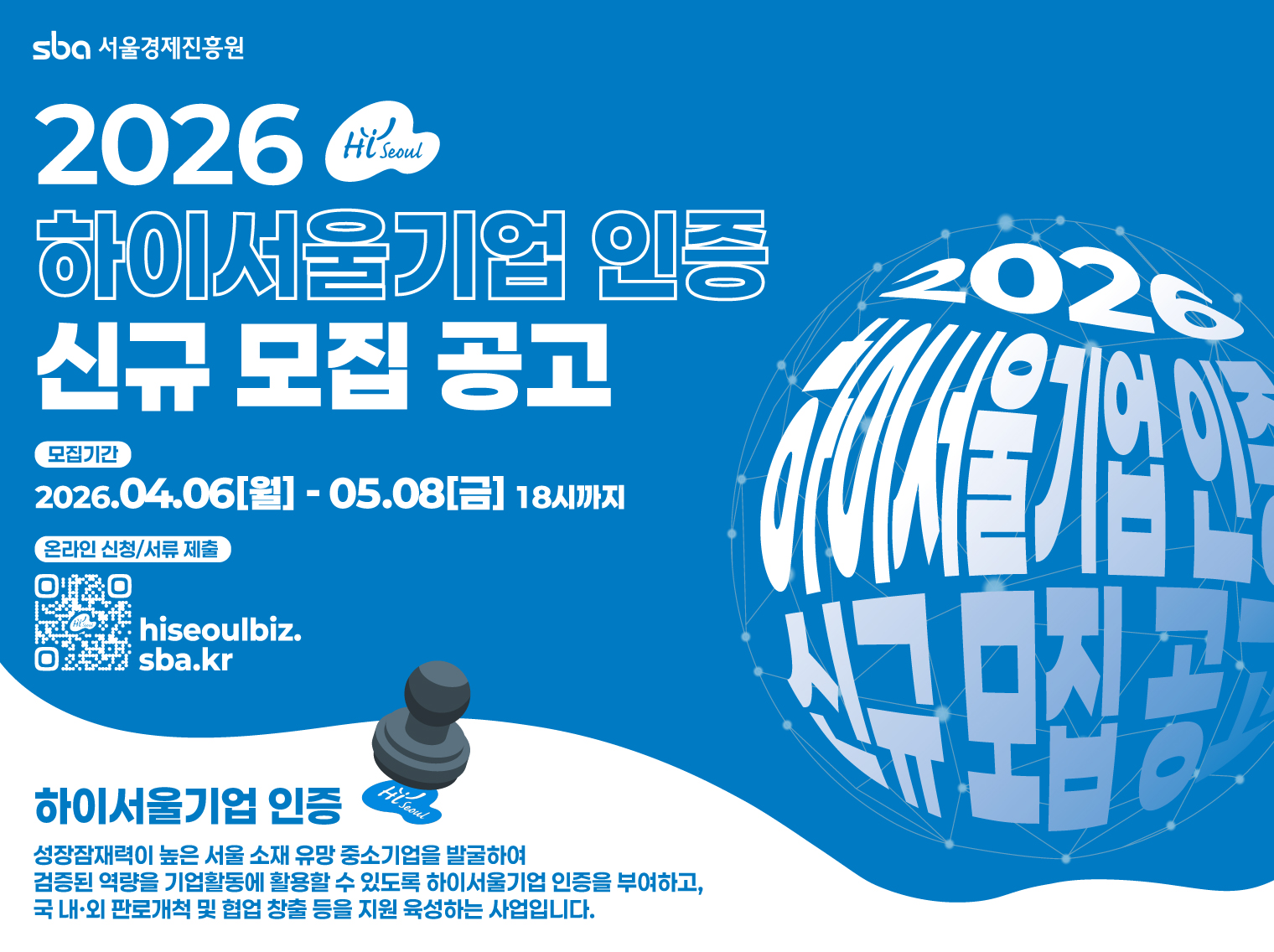 [서울경제진흥원] 2026년 하이서울기업 신규모집 공고 작성자관리자 작성일2026-04-21 조회수 11 첨부파일 [ 4 ] 1. 2026년 하이서울기업 신규모집 공고.pdf (331KB) 2. 2026년 하이서울기업 인증 신규 평가지표.pdf (430KB) 3. 2026년_하이서울기업_인증_신청_관련_FAQ.pdf (108KB) 4. 2026년 매뉴얼 프로세스_신규버전.pdf (1,849KB)