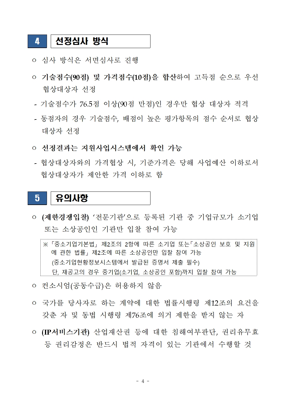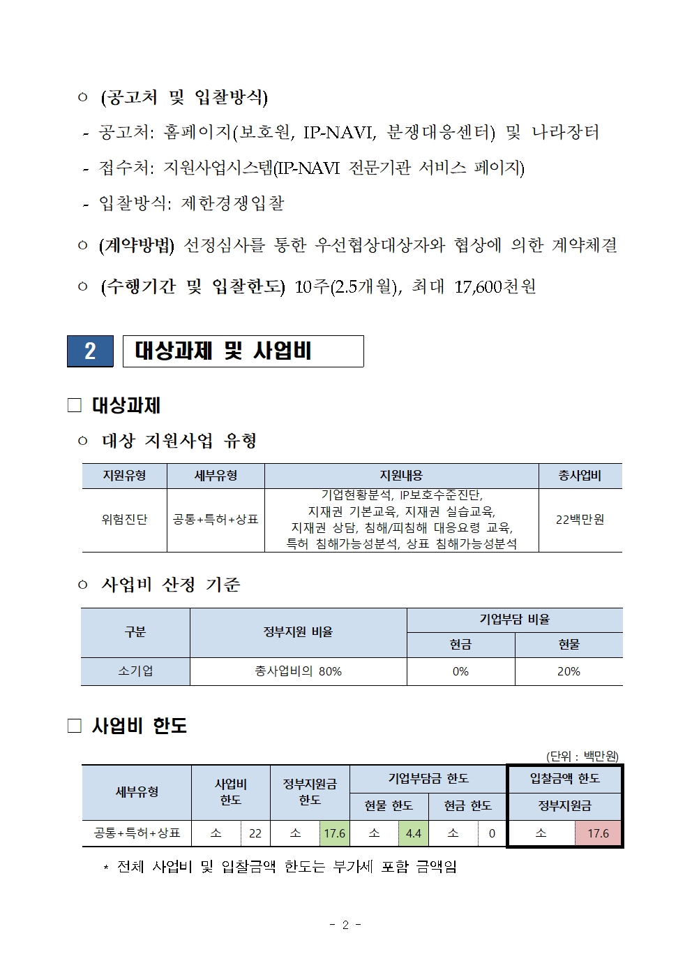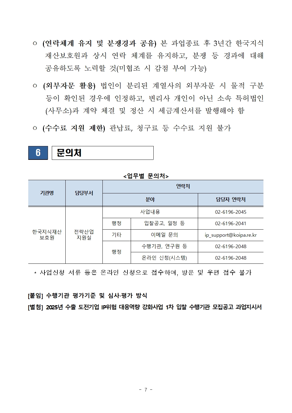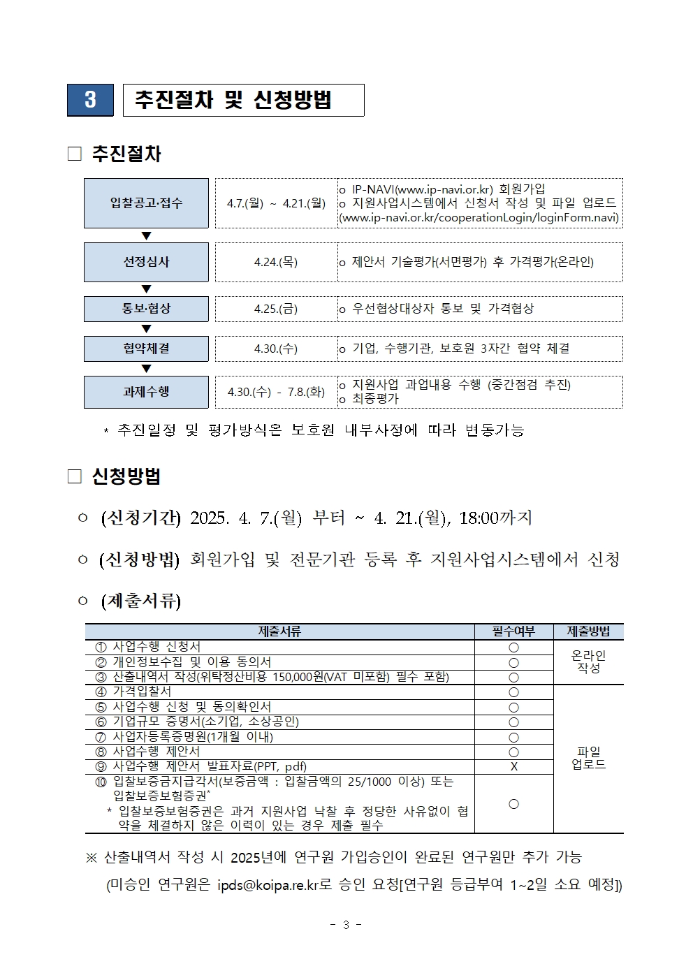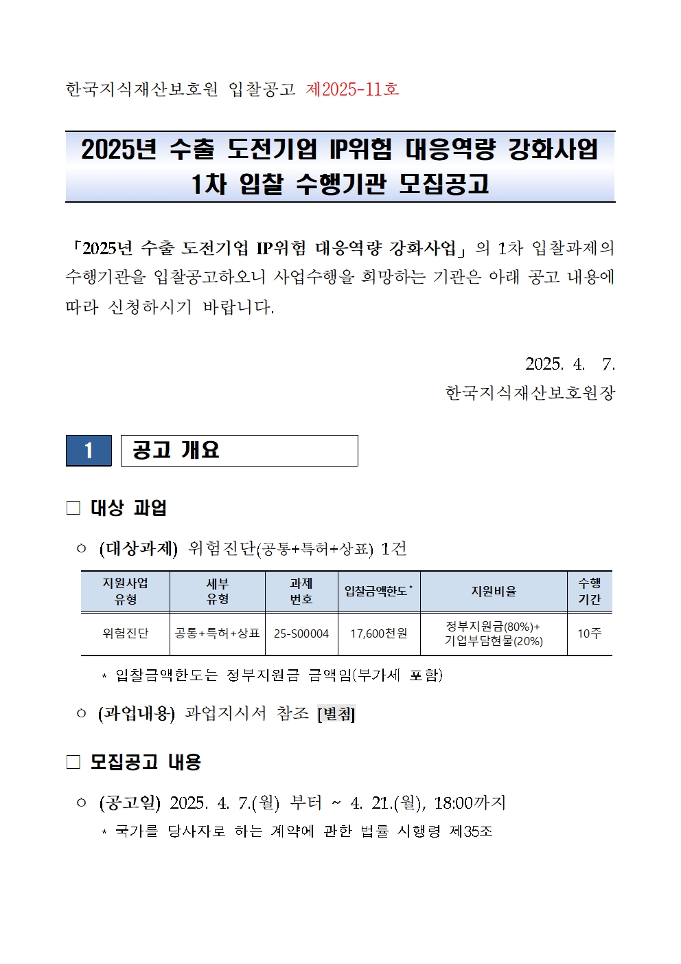 2025년 수출 도전기업 IP위험 대응역량 강화사업 1차 입찰 수행기관 모집공고 2025-04-07 조회수 179 첨부파일 다운로드 [붙임1] 2025년 수출 도전기업 IP위험 대응역량 강화사업 1차 입찰 수행기관 모집공고문.hwp [붙임2] 2025년 수출 도전기업 IP위험 대응역량 강화사업 1차 입찰 수행기관 모집공고 과업지시서.hwp [붙임3] 2025년 수출 도전기업 IP위험 대응역량 강화사업 1차 입찰 수행기관 모집공고 제안요청서.hwp _25년 입찰과제 가격입찰서 양식.hwp _25년 입찰보증금지급각서 양식.hwp