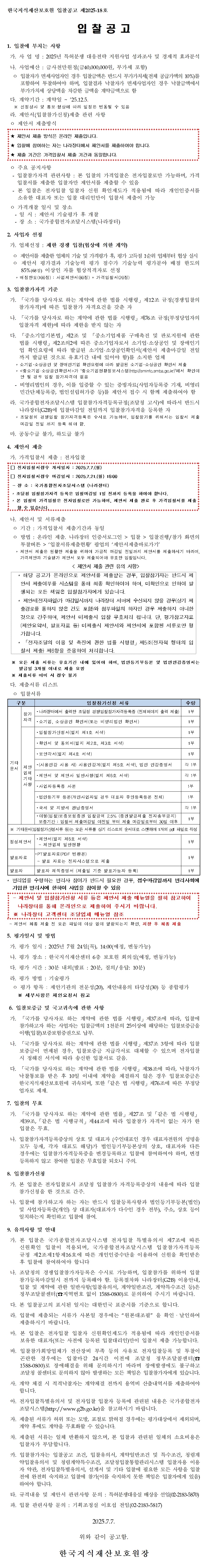 2025년 특허분쟁 대응전략 지원사업 성과조사 및 경제적 효과분석 입찰공고 2025-07-07 조회수 110 첨부파일 다운로드 2025년 특허분쟁 대응전략 지원사업 성과조사분석 용역_입찰공고문.pdf 2025년 특허분쟁 대응전략 지원사업 성과조사분석 용역_제안요청서.hwp
