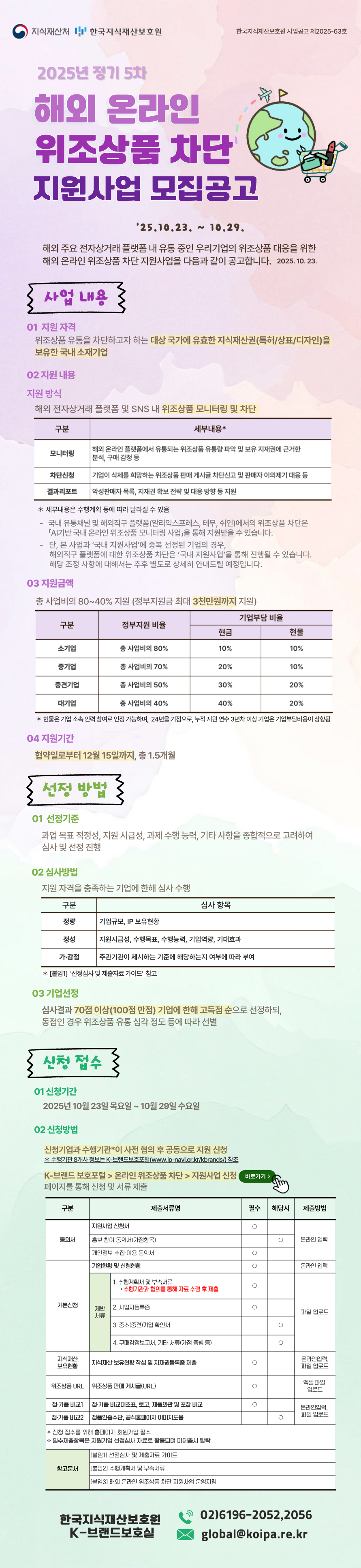 2025년 해외 온라인 위조상품 차단 지원사업 정기 5차 모집공고 (~10/29) 작성자관리자 작성일2025-10-23 조회수 130 첨부파일 [ 2 ] 2025년 해외 온라인 위조상품 차단 지원사업 정기 5차 모집 공고문.hwp (93KB) 5차 안내 사항 및 서류 양식.zip (4,532KB)
