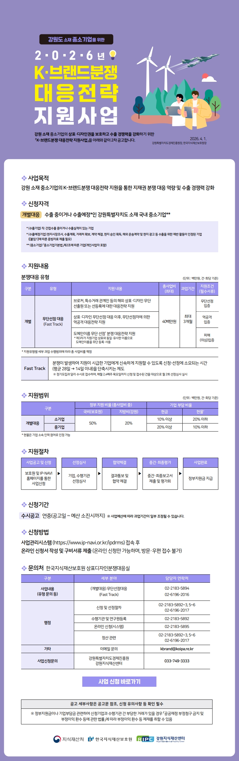 [강원연계_수시] 2026년 K-브랜드분쟁 대응전략 지원사업 수시 공고 작성자관리자 작성일2026-04-01 조회수 61 첨부파일 [ 2 ] [강원연계] 2026년 K-브랜드분쟁 대응전략 지원사업 수시 공고.pdf (364KB) 2026년 K-브랜드분쟁 대응전략 지원사업 공고 붙임자료.zip (3,663KB)