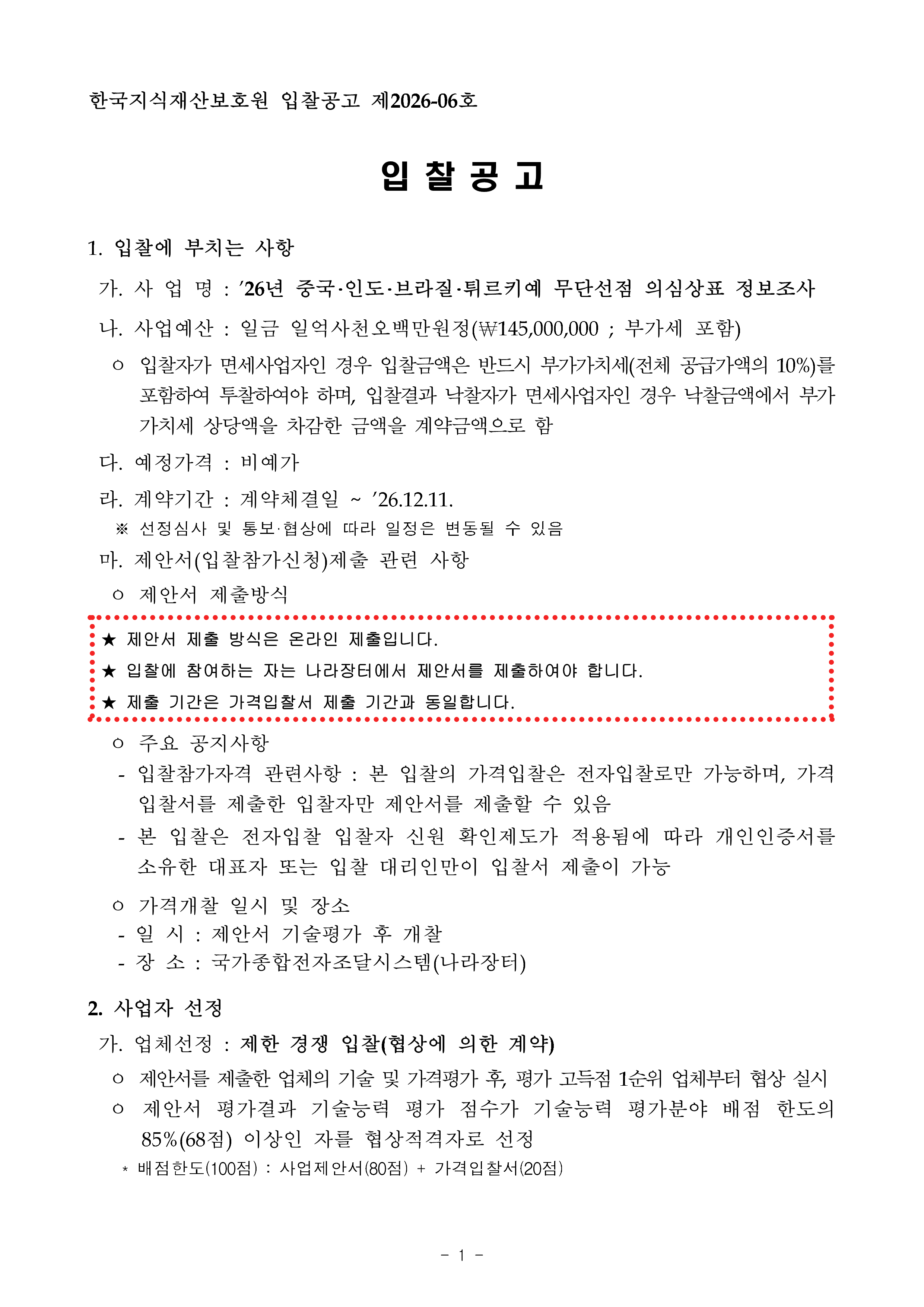 26년 중국·인도·브라질·튀르키예 무단선점 의심상표 정보조사 입찰공고 작성자관리자 작성일2026-02-26 조회수 13 첨부파일 [ 2 ] 2026년 중국·인도·브라질·튀르키예 무단선점 의심상표 정보조사 사업 공고문.pdf (1,009KB) 2026년 중국·인도·브라질·튀르키예 무단선점 의심 상표 정보조사 용역 제안요청서.hwp (192KB)