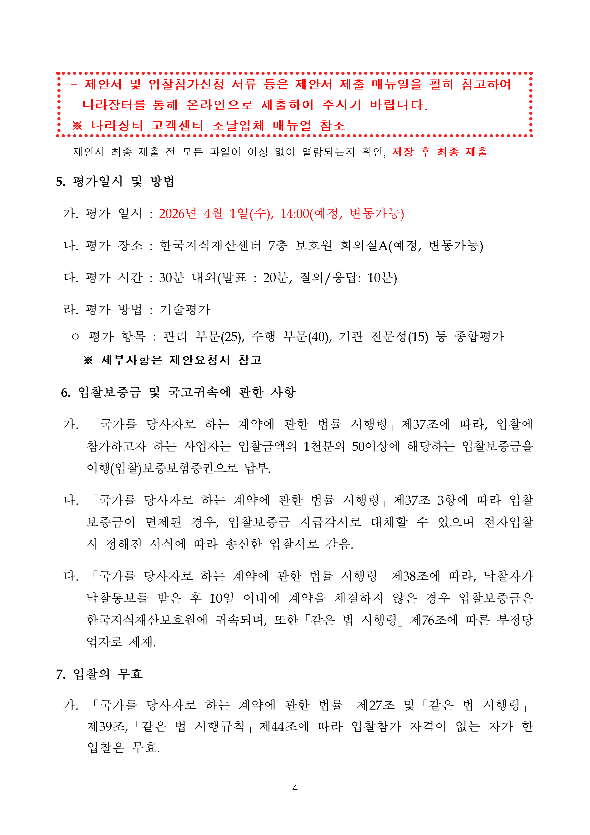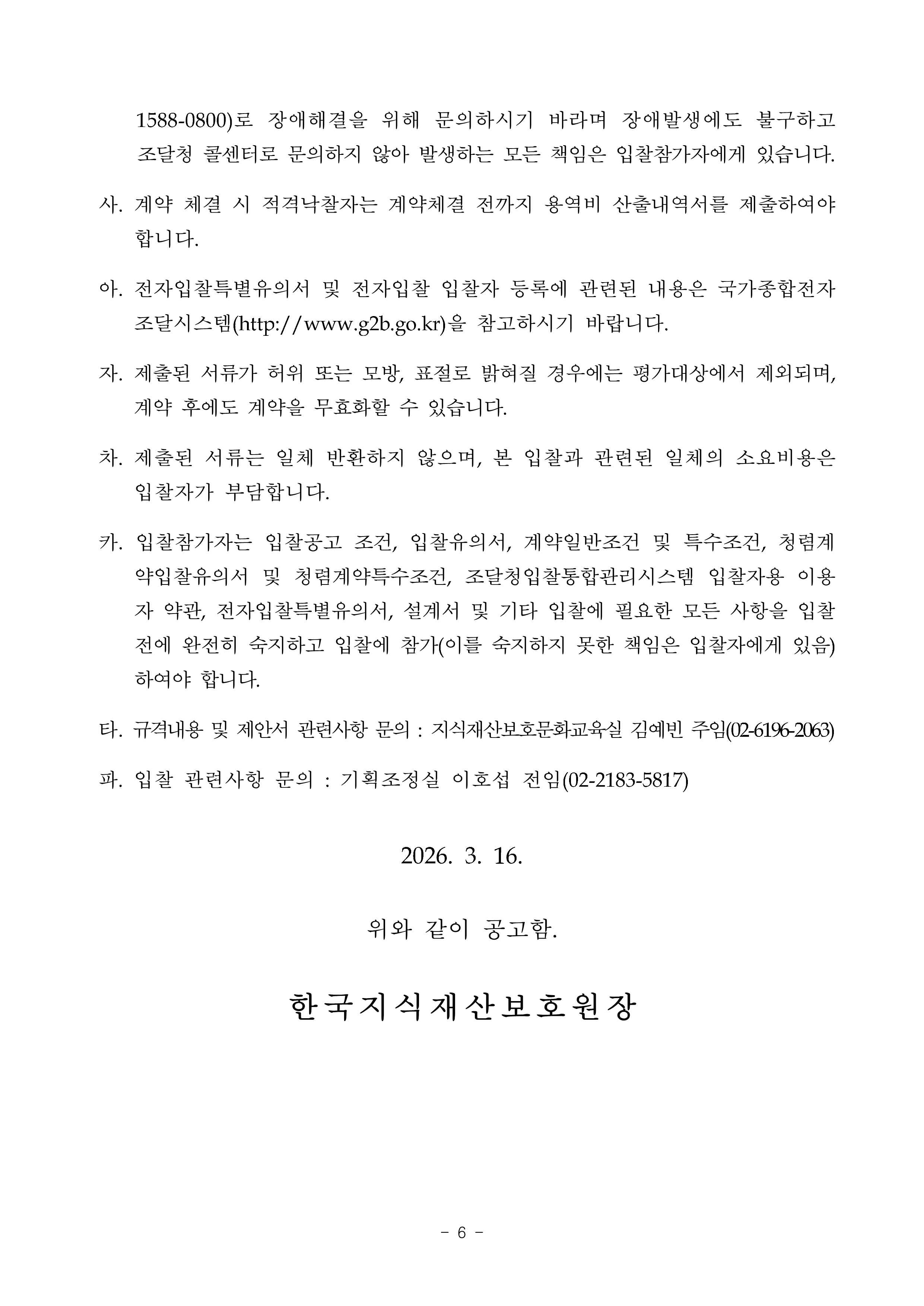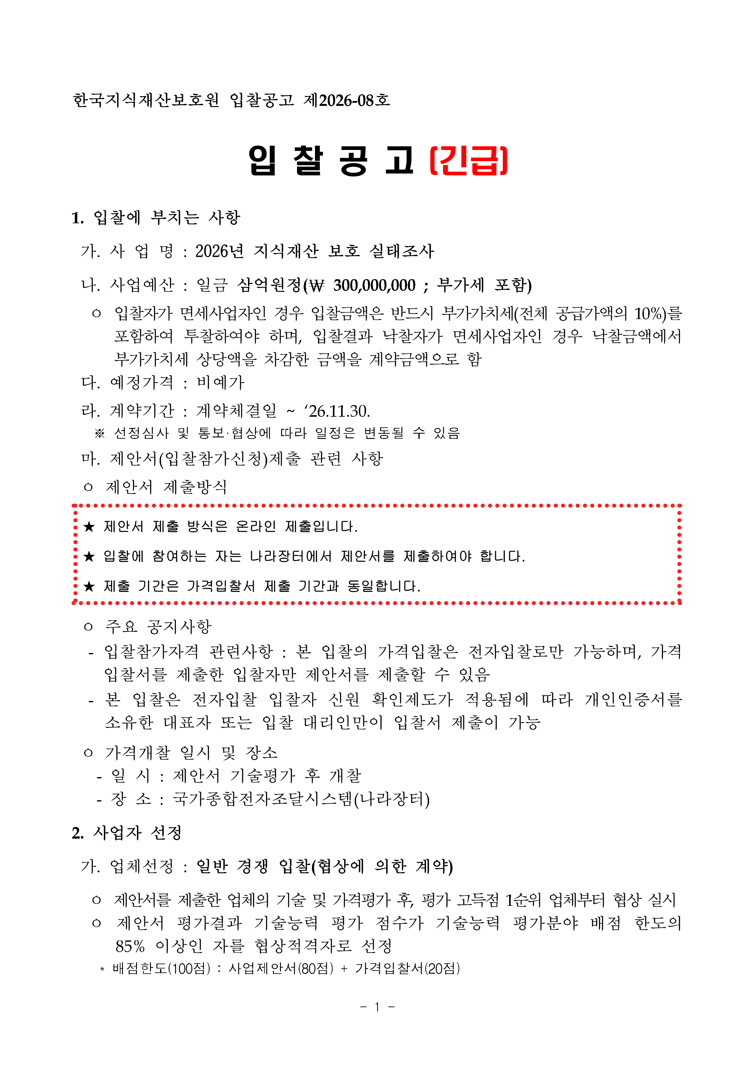 2026년 지식재산 보호 실태조사 입찰공고 작성자관리자 작성일2026-03-16 조회수 44 첨부파일 [ 3 ] 2026년 지식재산 보호 실태조사 용역 입찰공고.pdf (868KB) 2026년 지식재산 보호 실태조사 용역 긴급입찰사유서.hwp (122KB) 2026년 지식재산 보호 실태조사 용역 제안요청서.hwp (131KB)
