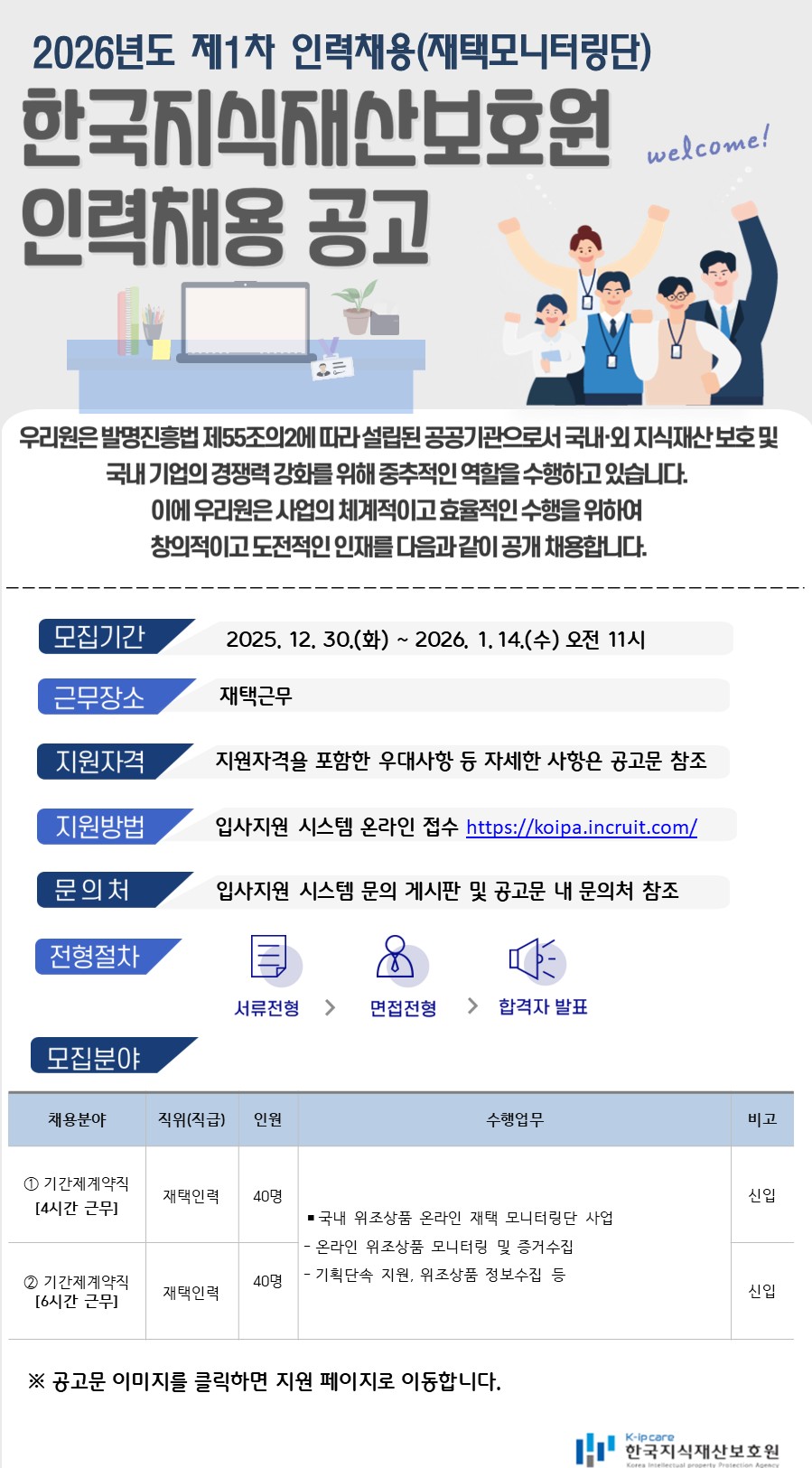 [채용공고_2026년 제1차] 한국지식재산보호원 인력채용 공고(재택모니터링단) 채용형태 계약직 모집기간2025-12-30 ~ 2026-01-14 상태 진행중 첨부파일 [ 6 ] 2026년도 제1차 인력채용 공고문.hwp (84KB) [첨부1] NCS 기반 직무기술서.hwp (57KB) [첨부2] 입사지원서(재택인력)_온라인 제출.hwp (128KB) [첨부3] 응시자격 적합여부 확인을 위한 개인정보 수집·이용·제공 동의서.hwp (79KB) [첨부4] 채용 결과 이의 신청서.hwp (42KB) [첨부5] 채용서류 반환청구서.hwp (35KB)