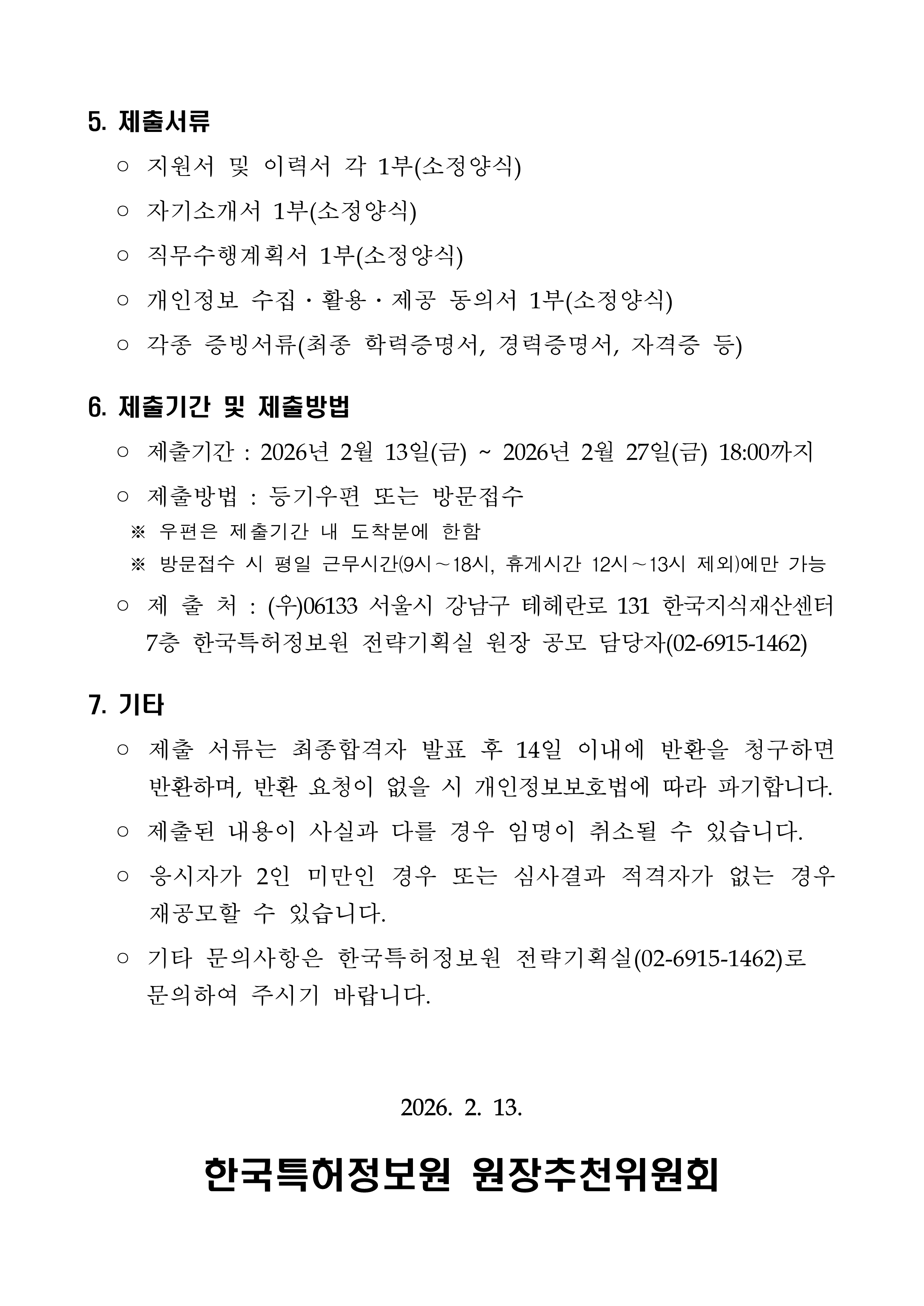 [한국특허정보원] 한국특허정보원 원장 초빙 공모 작성자관리자 작성일2026-02-12 조회수 23 첨부파일 [ 2 ] [첨부] 한국특허정보원 원장 초빙 공고문.pdf (139KB) [붙임] 한국특허정보원 원장 초빙 공고 관련자료.pdf (208KB)